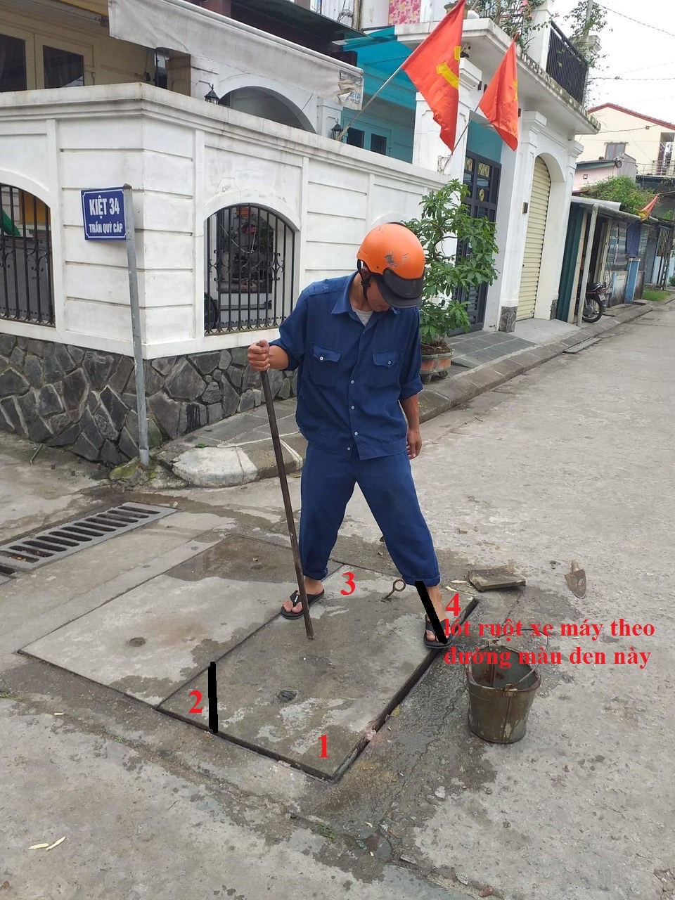 Bước 02: Lấy ruột xe máy (xin tại các chổ sửa xe máy) tròng qua vị trí số 4 rồi hạ nắp cống xuống về vị trí cũ. Kiểm tra bằng cách đứng nhún hoặc quan sát xe ô tô chạy qua xem còn gập ghềnh, còn phát ra tiếng động hay không. Nếu còn thì làm thêm tương tự ở vị trí số 2. Nếu hết kêu thì dùng kéo hay dao cắt phần dư thừa của ruột xe trên bề mặt đường.