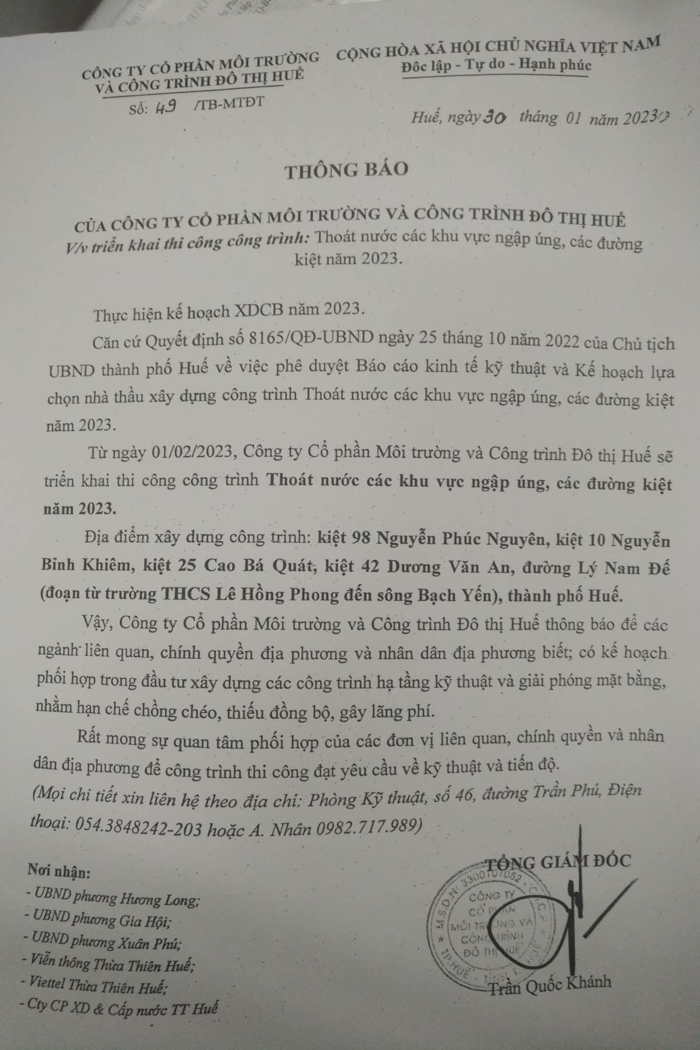 Vấn đề Quý Ông/Bà phản ánh, Công ty CP Môi trường và Công trình Đô thị Huế xin thông báo kết quả xử lý như sau: