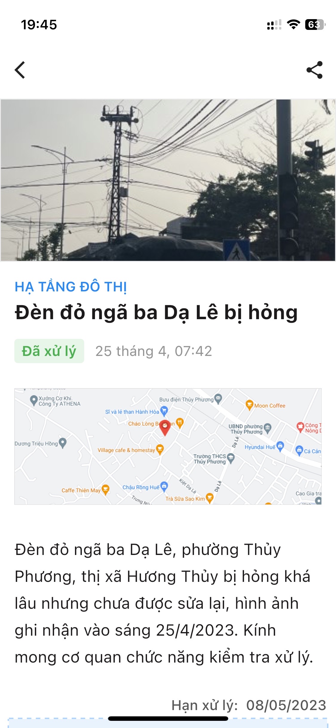 Đèn đỏ ngã ba Dạ Lê, phường Thủy Phương, thị xã Hương Thủy đã xử lý, nhưng đèn vẫn chưa hoạt động. Thời điểm ghi nhận 18h55p ngày 4/5/2023. Kính gửi cơ quan chức năng kiểm tra.