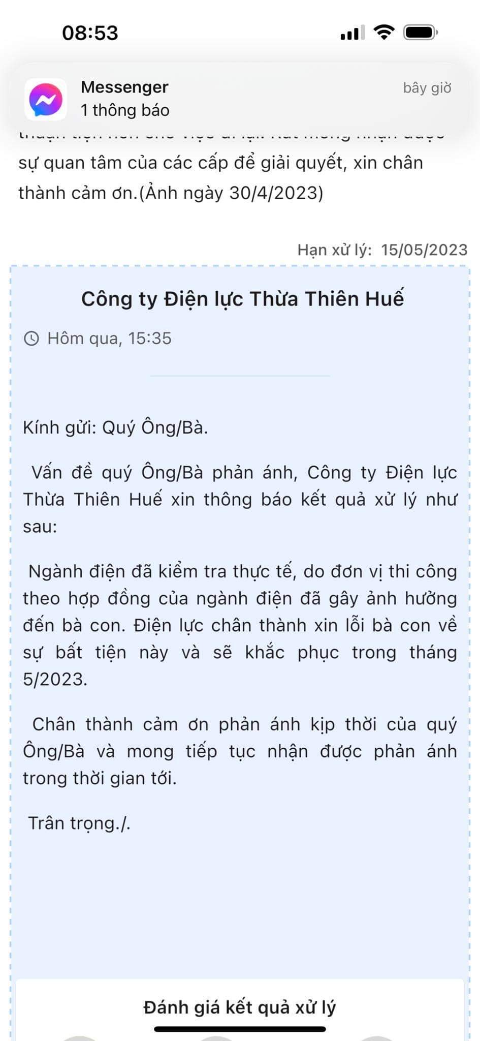 Vấn đề quý Ông/Bà phản ánh, Công ty Điện lực Thừa Thiên Huế xin thông báo kết quả xử lý như sau: