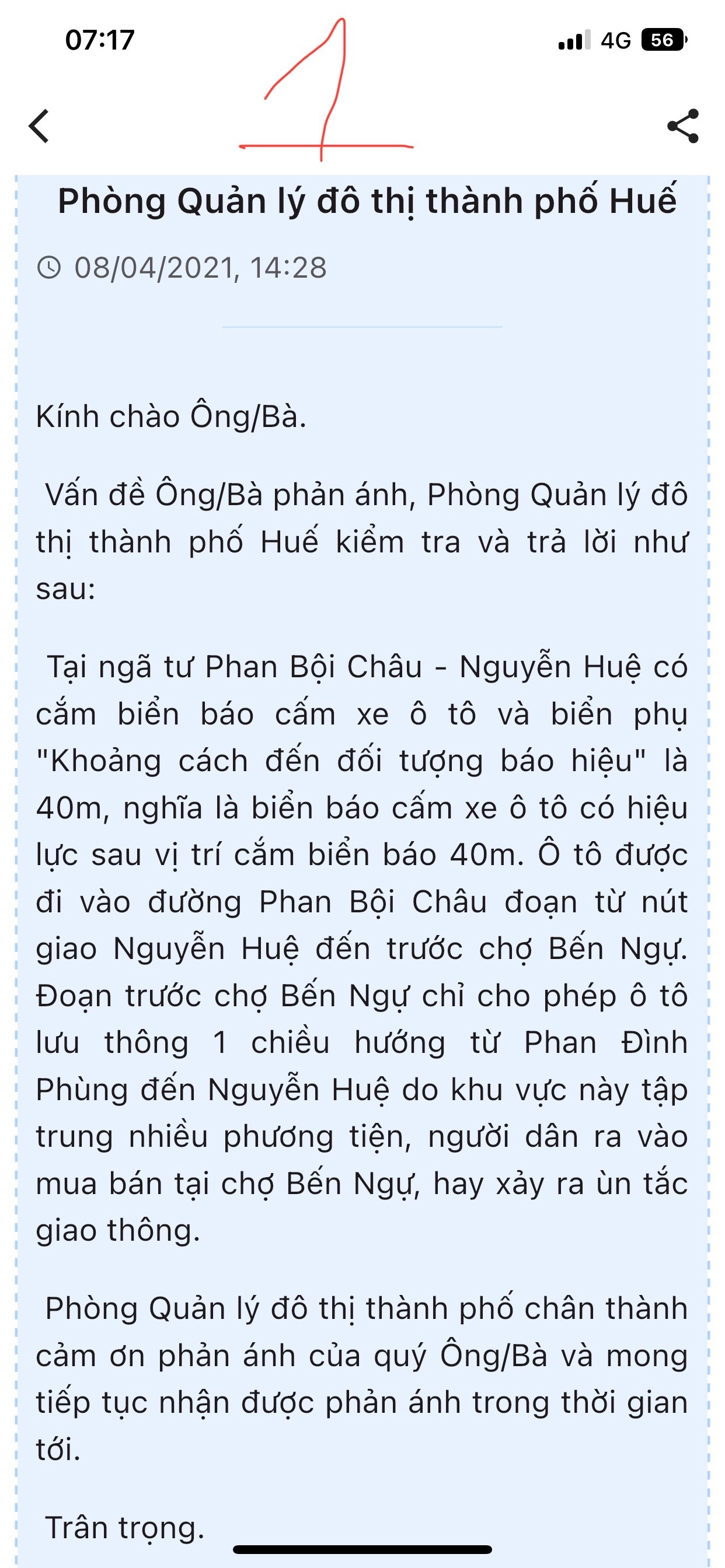 Ngay nơi giao nhau ngã tư giữa Nguyễn Huệ và Phan Bội Châu có tồn tại 1 biển báo cấm ô tô 40m (ảnh số 4), trước đó tôi có thắc mắc về vấn đề cấm ô tô trên tuyến đường này thì được hạ tầng đô thị trả lời như hình (số 1) tức là vẫn cho phép ô tô đi từ đường Nguyễn Huệ vào đường Phan Bội Châu đến trước chợ Bến Ngự, nhưng biển báo trên lại cấm sau 40m, rồi nếu đi từ đường Trần Thúc Nhẫn rẽ trái ra đường Phan Bội Châu ngay ngã ba chợ Bến Ngự thì không hề có biển báo cấm ô tô rẽ trái hay rẽ phải gì cả (hình số 2). Rồi khi đứng trước mặt chợ Bến Ngự nhìn về hướng cầu Bến Ngự cũng không hề có biển cấm ô tô mà chỉ thấy 1 biển cấm ô tô rẽ phải về Phan Đình Phùng ngay góc nhà thuốc Mạnh Tý (hình số 3). Như vậy theo 3 yếu tố trên thì hạ tầng đô thị trả lời là cho phép ô tô đi vào từ ngã tư Nguyễn Huệ vào Phan Bội Châu đến chợ Bến Ngự thậm chí đi qua cầu Bến Ngự đều được phép chỉ đi qua cầu Bến Ngự bắt buộc phải rẽ phải vì hai tuyến đường Phan Chu Trinh và Phan Đình Phùng đã là đường ô tô 1 chiều là chính xác. Theo lẽ đó thì biển báo tại nút giao ngã tư Nguyễn Huệ và Phan Bội Châu đang mâu thuẫn với 3 yếu tố trên hay nói cách khác biển báo này không còn phù hợp và đang bẫy người dân, thường ngày rất nhiều lực lượng cảnh sát giao thông, cảnh sát đô thị cũng như lực lượng công an phường thường xuyên xử phạt các xe ô tô đi vào tuyến đường này. Nếu xét thấy biển báo không còn phù hợp hay không còn hợp lý kiến nghị hạ tầng đô thị thu hồi hay xử lý biển báo trên để người dân an tâm đi lại tránh bị xử phạt 1 cách oan ức!