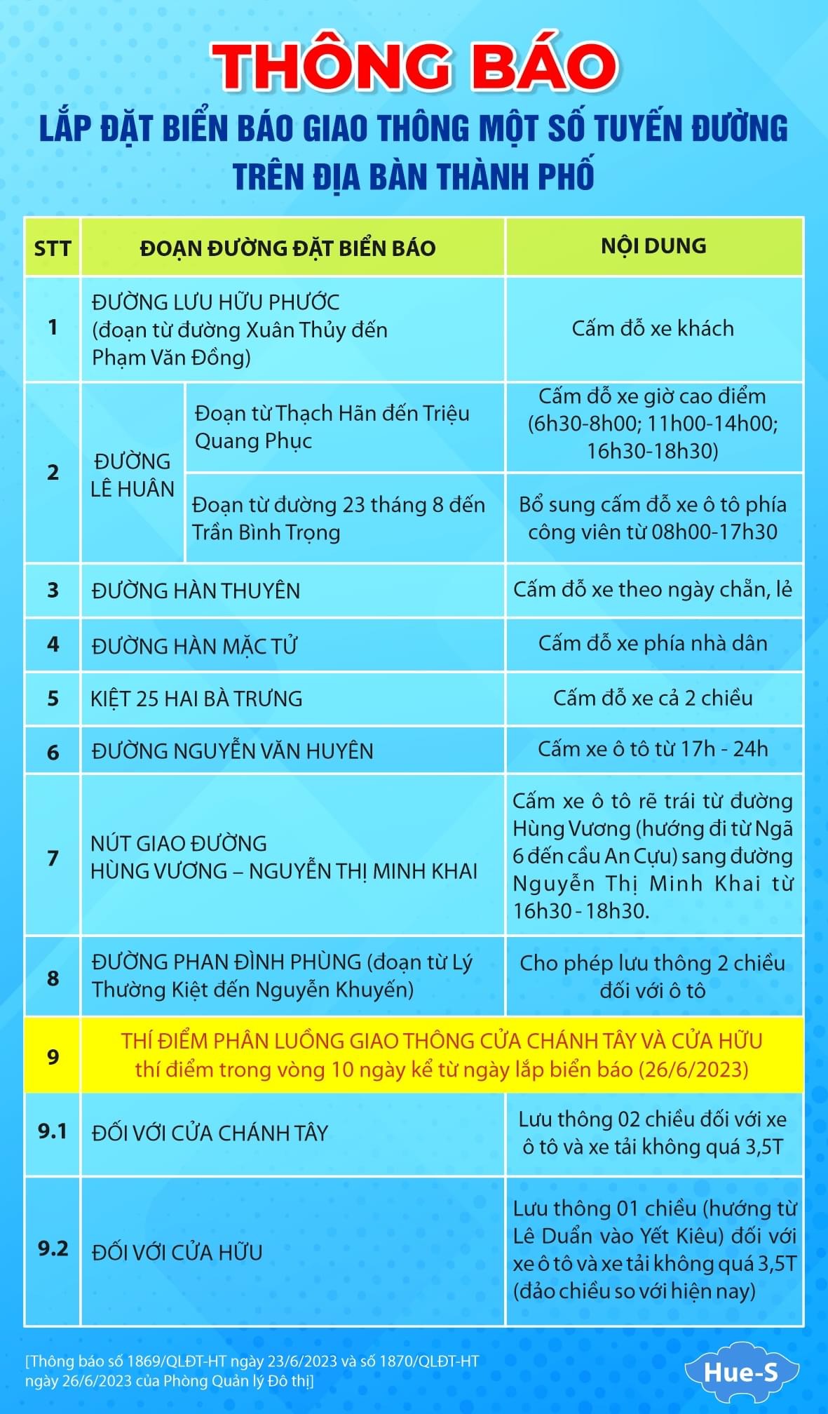 Liên quan đến nội dung phản ánh, Hiện tại các cổng thành trong đó có cửa Chánh tây và Cửa Hữu đều có cắm biển hạn chế tải trọng (5 Tấn); như vậy, các xe có tải trọng trên 5 Tấn không được phép ra vào 2 cổng trên. Để giảm tải cho bến xe Nguyễn Hoàng, thành phố cho phép lưu thông đối với các phương tiện dưới 30 chỗ ngồi chở khách đi vào Cửa Quảng Đức và ra Cửa nhà Đồ bắt đầu từ 8h đến 16h hằng ngày theo hướng từ đường Quảng Đức - Ông Ích Khiêm - Nguyễn Trãi.