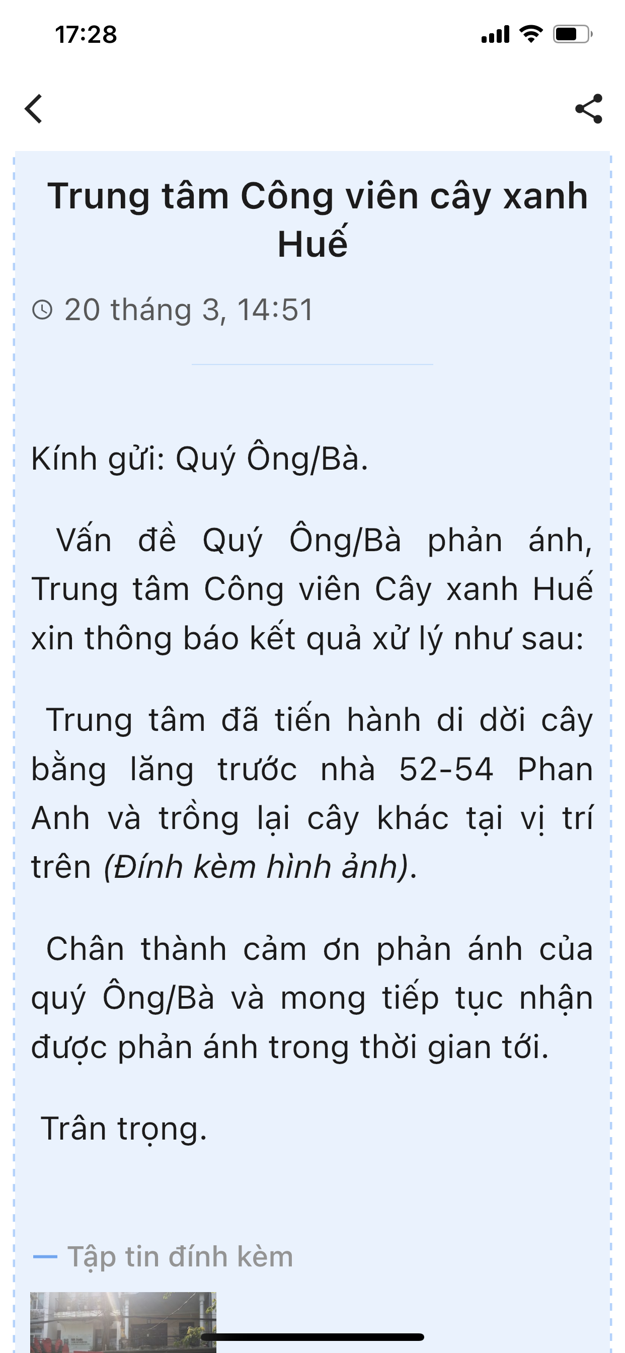 Vấn đề quý Ông/Bà phản ánh, Trung tâm Công viên Cây xanh Huế xin thông báo kết quả xử lý như sau: