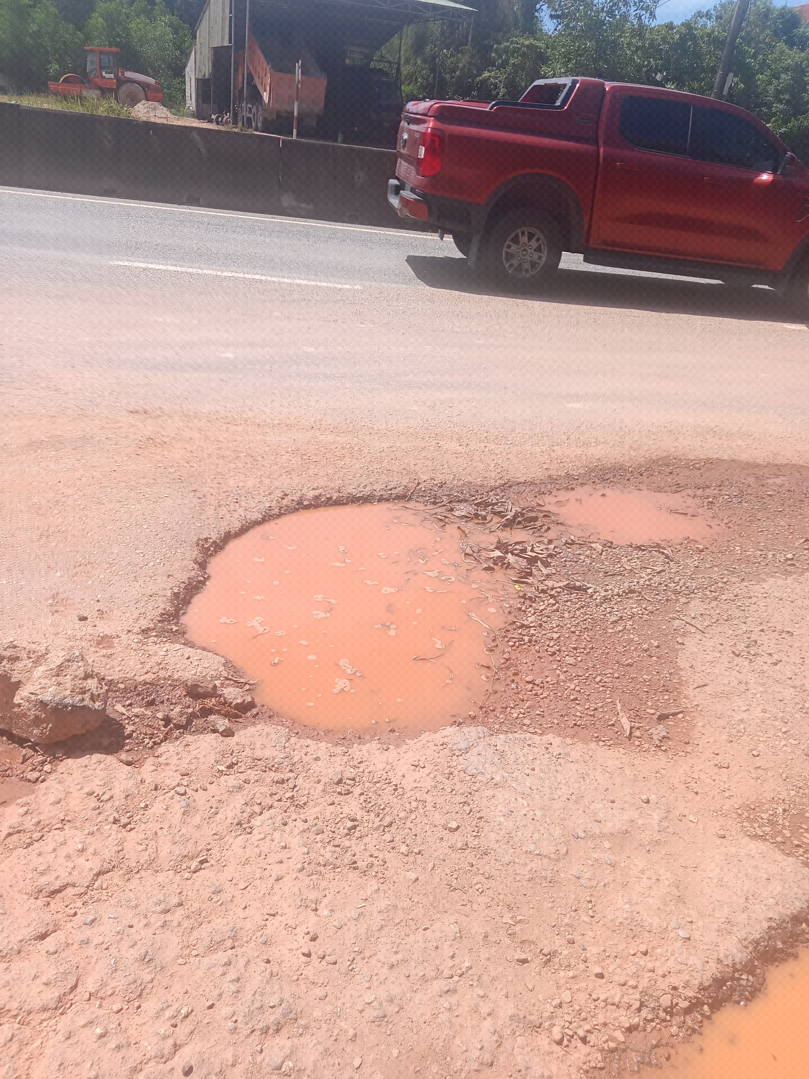 Để đảm bảo an toàn giao thông tạm thời Công ty TNHH Trùng Phương đã dập vá các vị trí hư hỏng bằng bê tông nhựa (do nền mặt đường đang còn ẩm ướt vì đơn vị vận chuyển thường xuyên tưới nước để giảm bụi). (Hình ảnh kèm theo)
