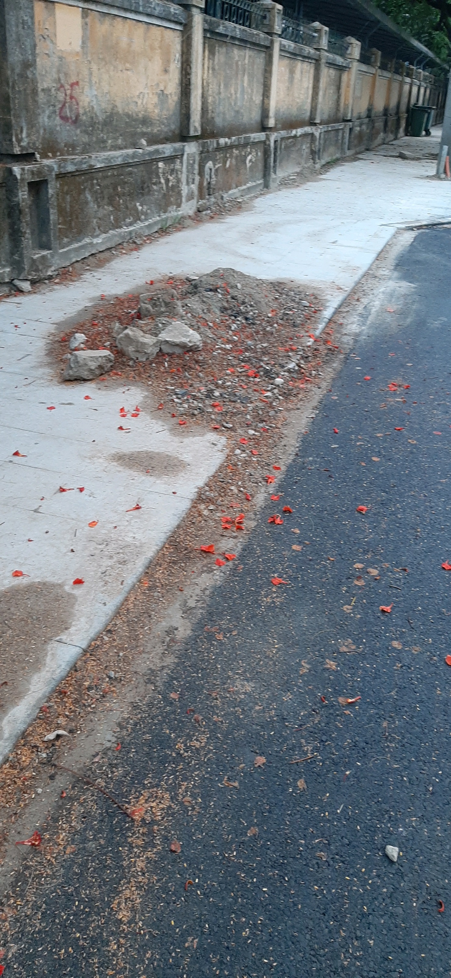 -Trên lề đường vẫn còn những đống đất đá, xà bần...nằm ngỗn ngang làm mất mỹ quan và cản trở cho người đi bộ trên lề đường.