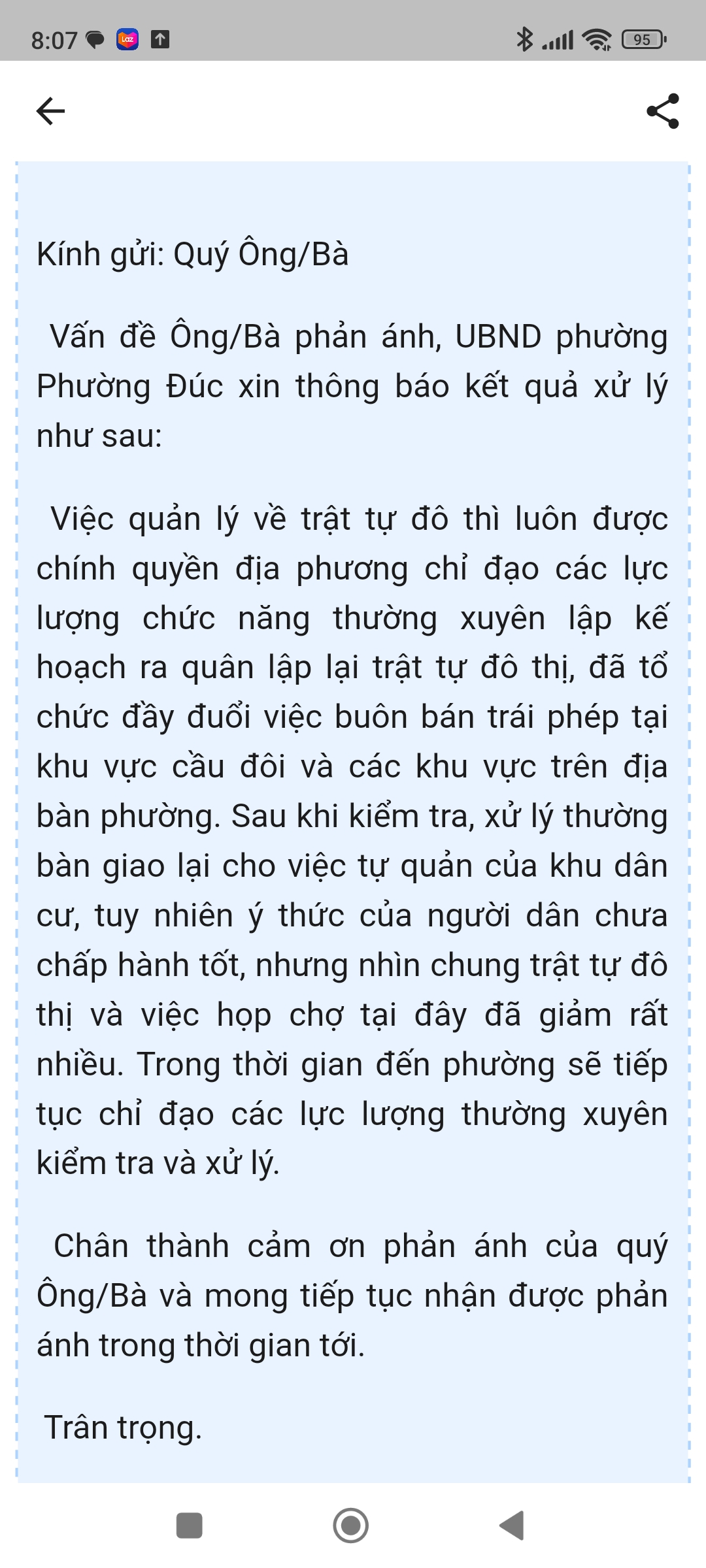 Vấn đề quý Ông/Bà phản ánh, UBND phường Phường Đúc xin thông báo kết quả xử lý như sau: