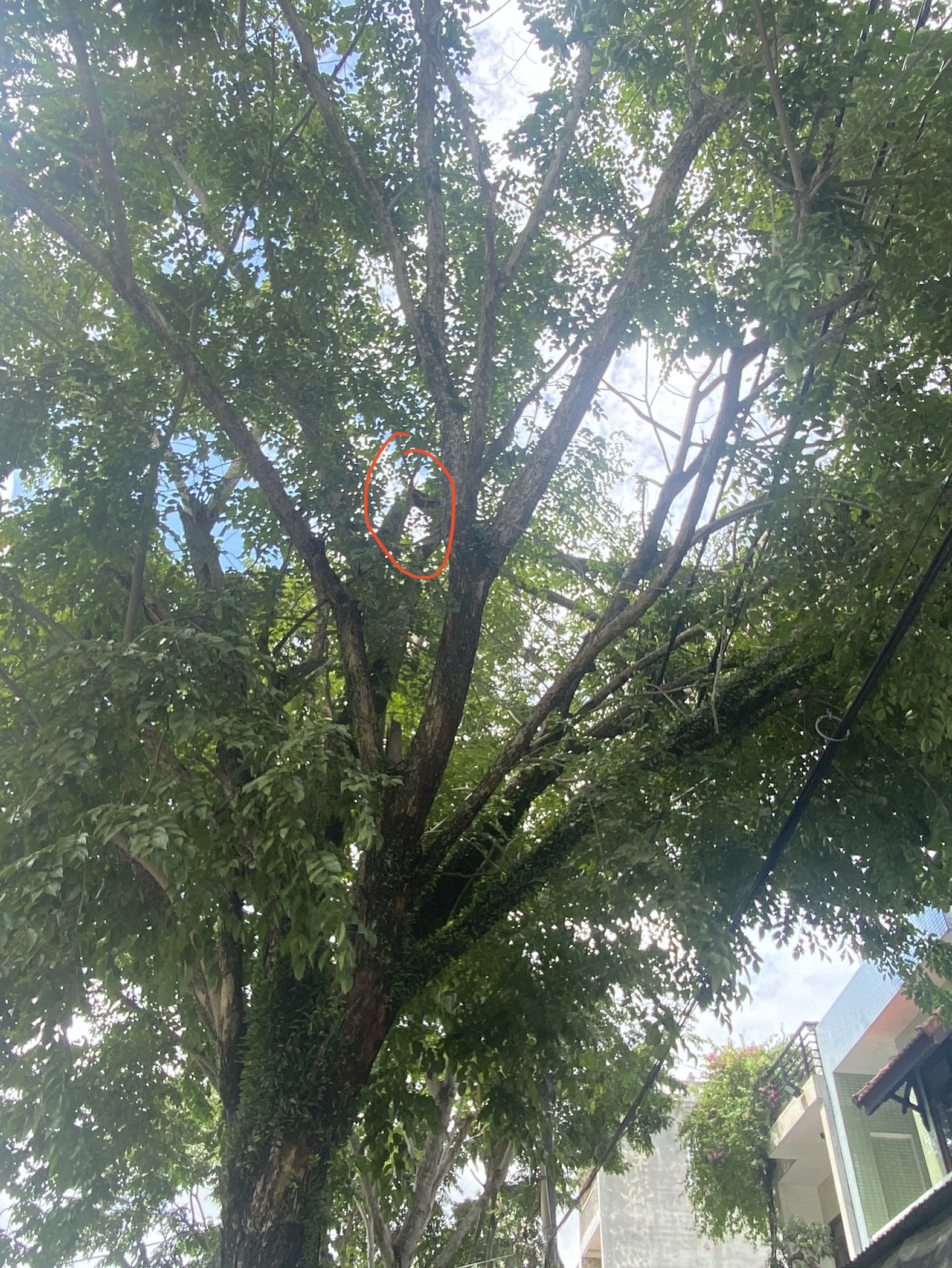 Cây xanh gãy cành do mưa lớn trước số 16 Hồ Quý Ly, Phú Hậu, TP Huế có khả năng cao vướng đường dây điện. Kính chuyển cơ quan chức năng kiểm tra.