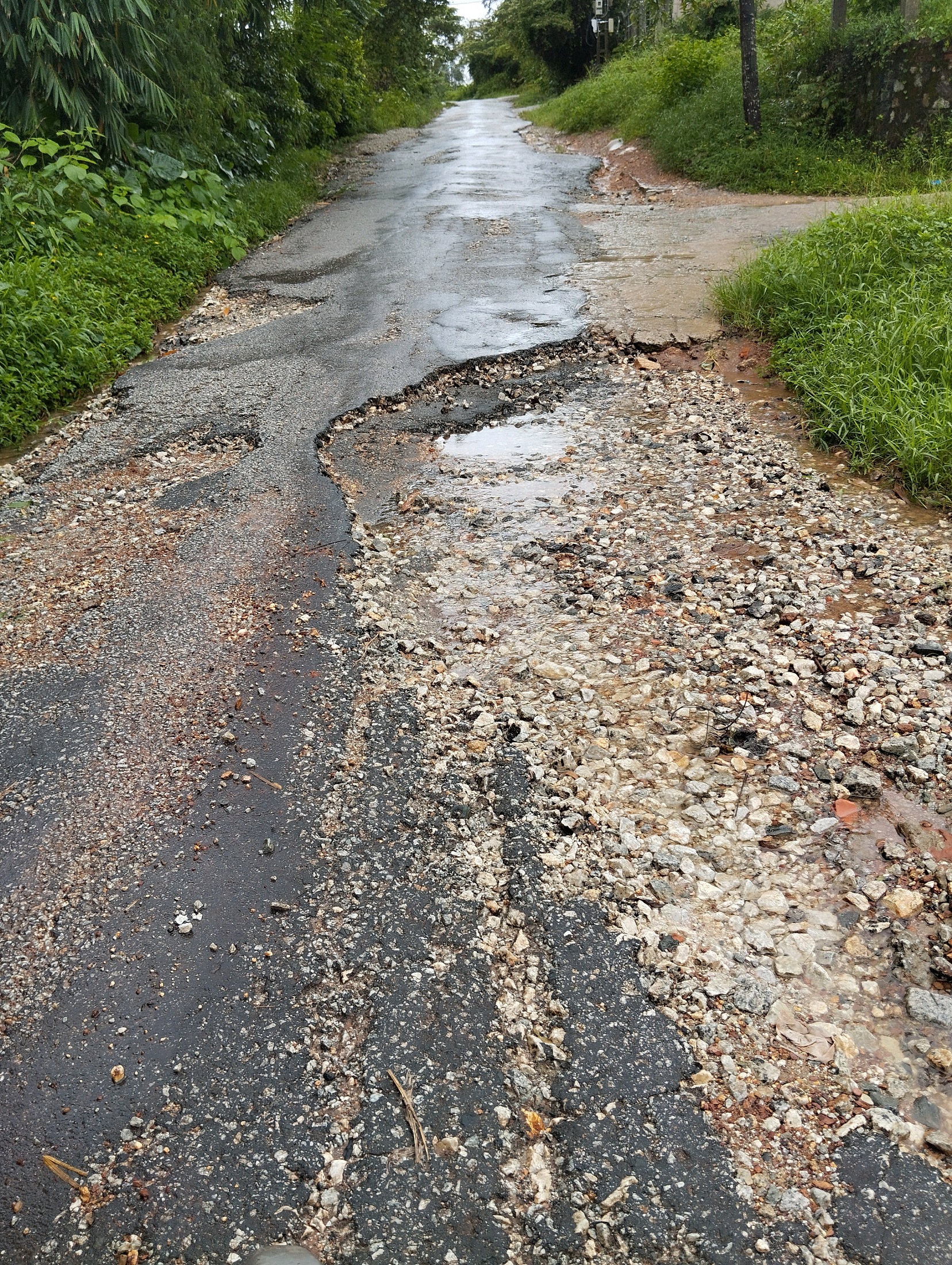 Đường Tôn Thất Sơn, phương Thủy Phương, TX Hương Thủy (đoạn từ ngã tư nối Trưng Nữ Vương đến đường tránh) bị hư hỏng nghiêm trọng, rất khó lưu thông, khi trời mưa to nước chảy không thấy đường đi. Rất dễ gây tai nạn (ảnh ngày 12/10/2023)