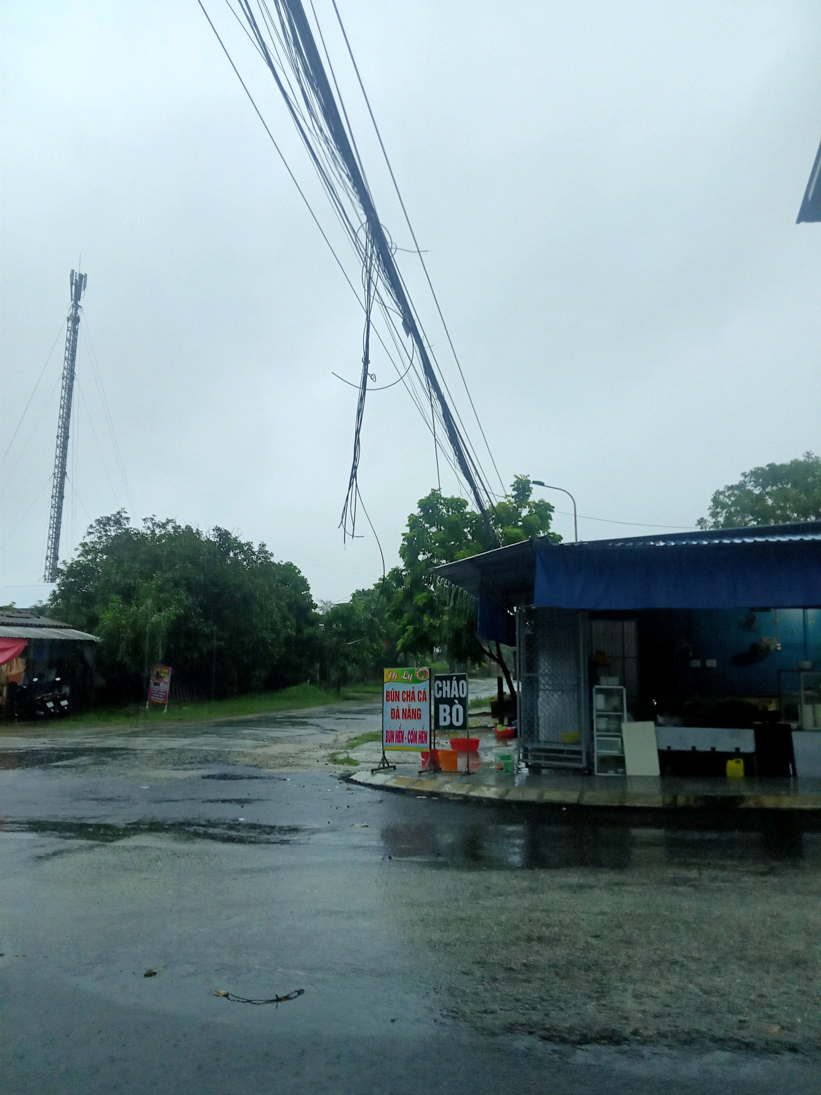 Đường dây điện sà xuống cách mặt đường khoảng 2m ngay ngã tư Nguyễn Khoa Văn và Trưng Nữ Vương, phường Phú Bài, thị xã Hương Thủy rất nguy hiểm cho người tham gia giao thông trong mùa mưa này. Đề nghị cơ quan có thẩm quyền giải quyết.Cám ơn. Hình ảnh chụp lúc 10h20 ngày 13/10/2023.
