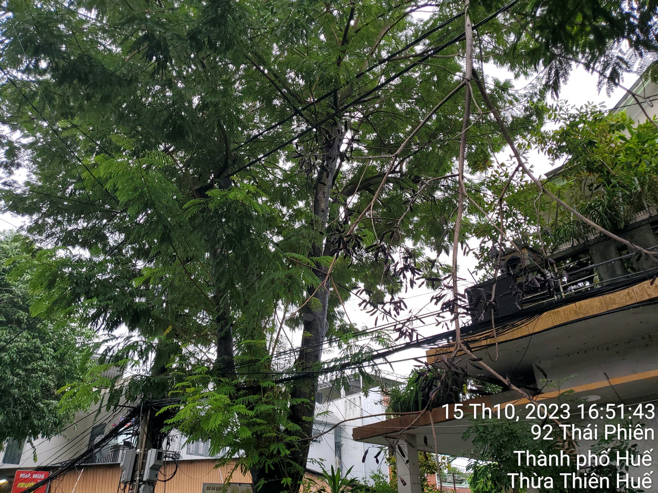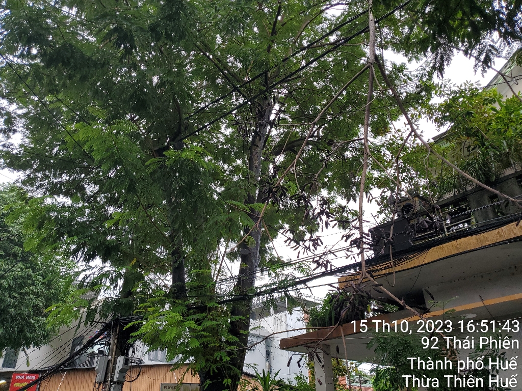 Dây điện chằng chịt trên các nhánh cây phượng, đã có nhánh gãy mắc trên dây điện, tại nhà số 92 Thái Phiên, phường Tây Lộc. Để an toàn trong mùa mưa bão, kính đề nghị các cơ quan chức năng xử lý. Cám ơn.