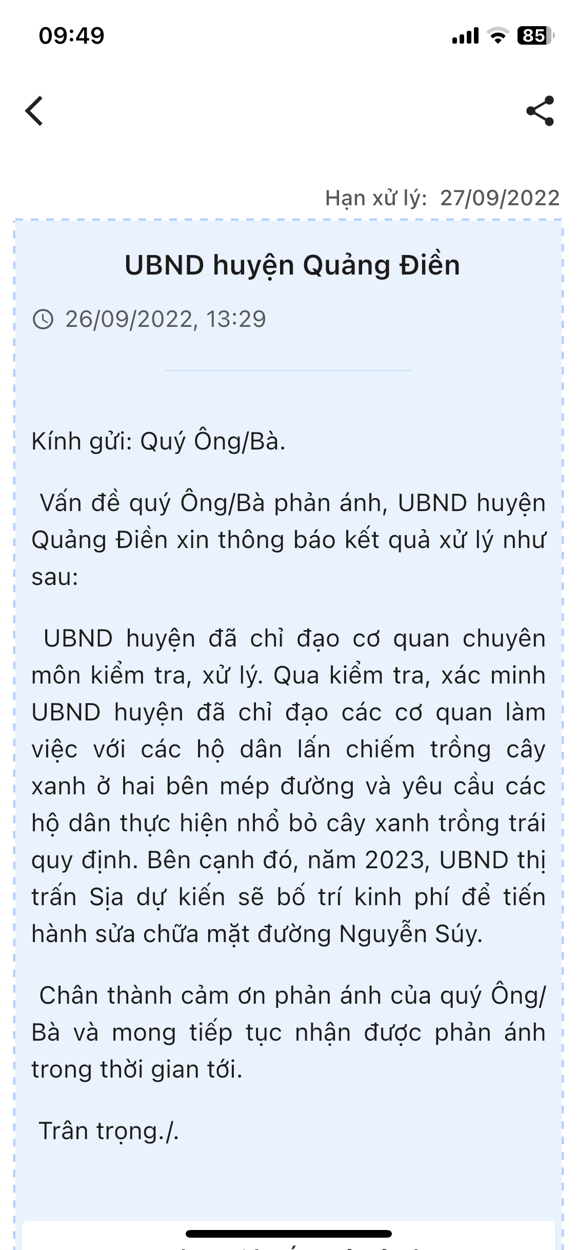 Vấn đề quý Quý cá nhân/tổ chức phản ánh, UBND thị trấn Sịa xin thông báo kết quả xử lý như sau:
