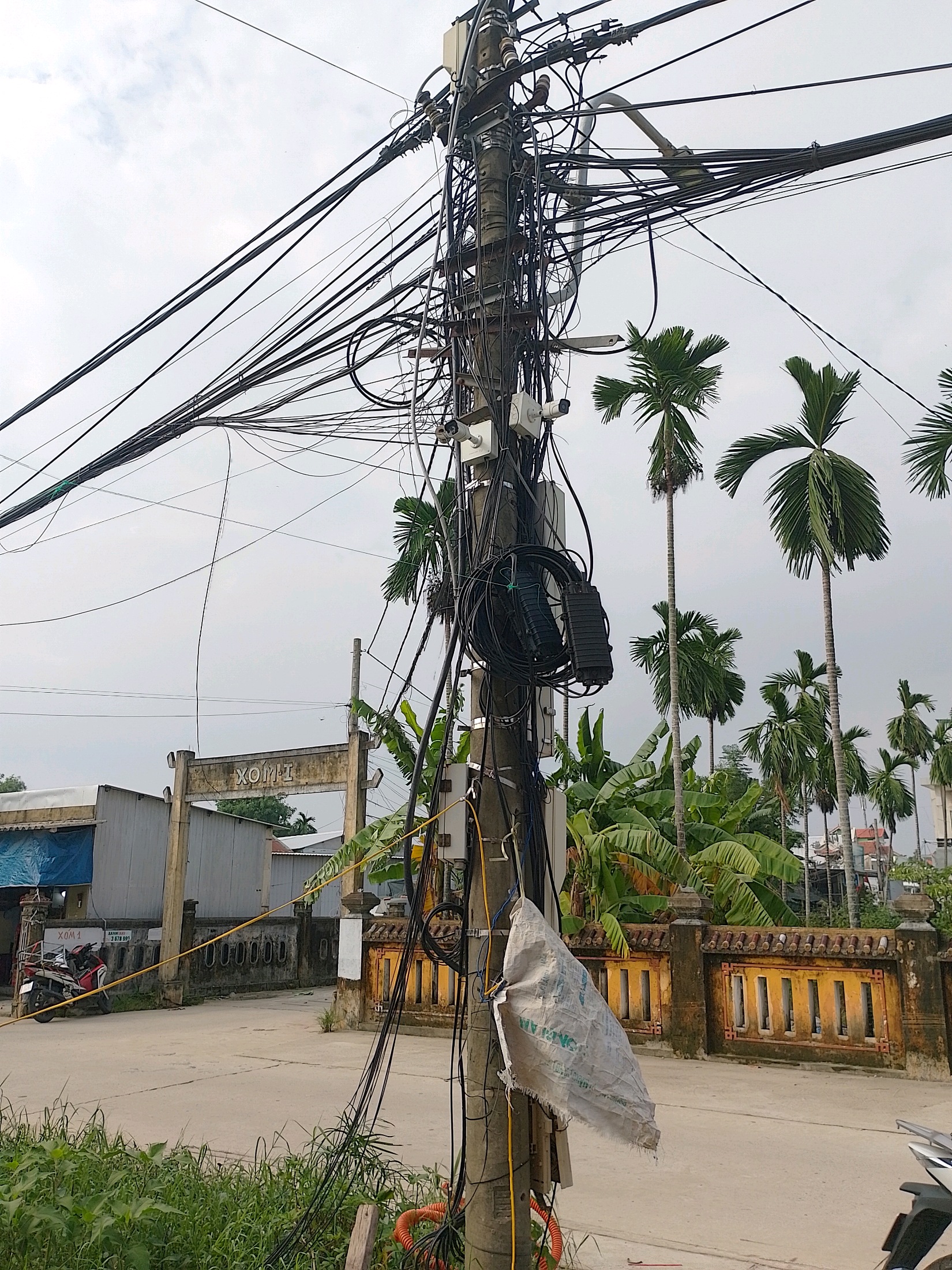 Dây cáp viễn thông chằng chịt gây mất thẩm mỹ (1 số cuộn dây đã cắt không thu gom rất nguy hiểm khi gió thổi sà ra đường).