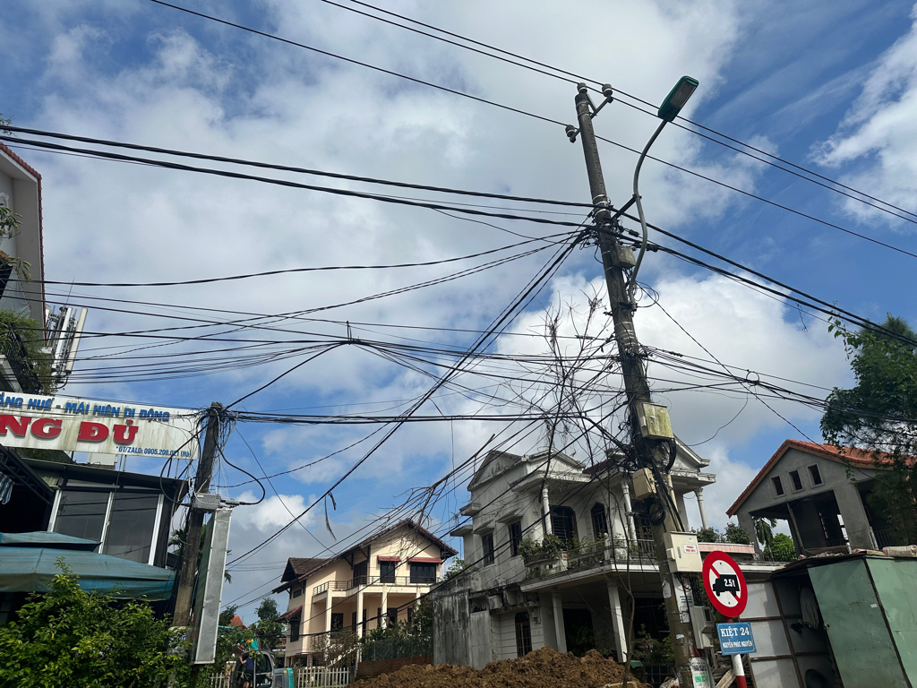 Dây điện và cáp viễn thông giăng chằng chịt tại đầu kiệt 24 Nguyễn Phúc Nguyên, phường Kim Long, TP Huế