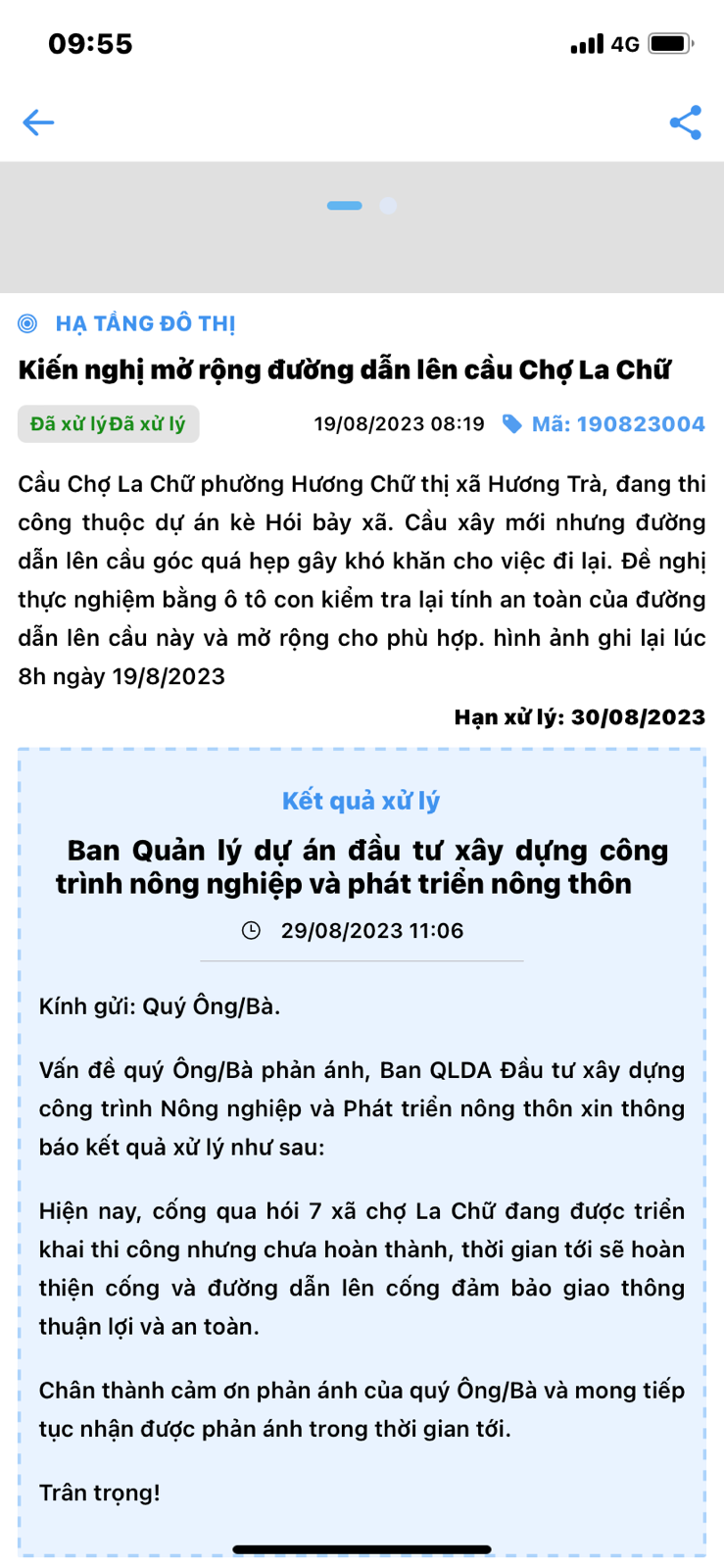 - Công trình mà quý Ông/Bà phản ánh đề nghị mở rộng đường dẫn lên cầu Chợ La Chữ Cầu Chợ La Chữ phường Hương Chữ thị xã Hương Trà, đang thi công thuộc dự án kè Hói 7 xã. Ý kiến này chúng tôi đã tiếp nhận và đã thực hiện (có hình ảnh kèm theo).