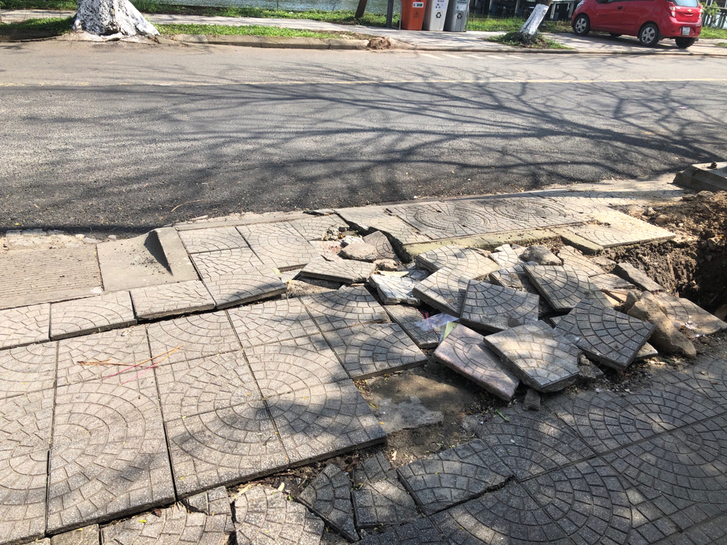 Yêu cầu xử lý vỉa hè do Công ty cây xanh nhổ cây làm hỏng 1 đoạn đường trên vỉa hè. Trước cổng nhà 133 Nguyễn Trãi, phường Thuận Hoà, Thành phố Huế.