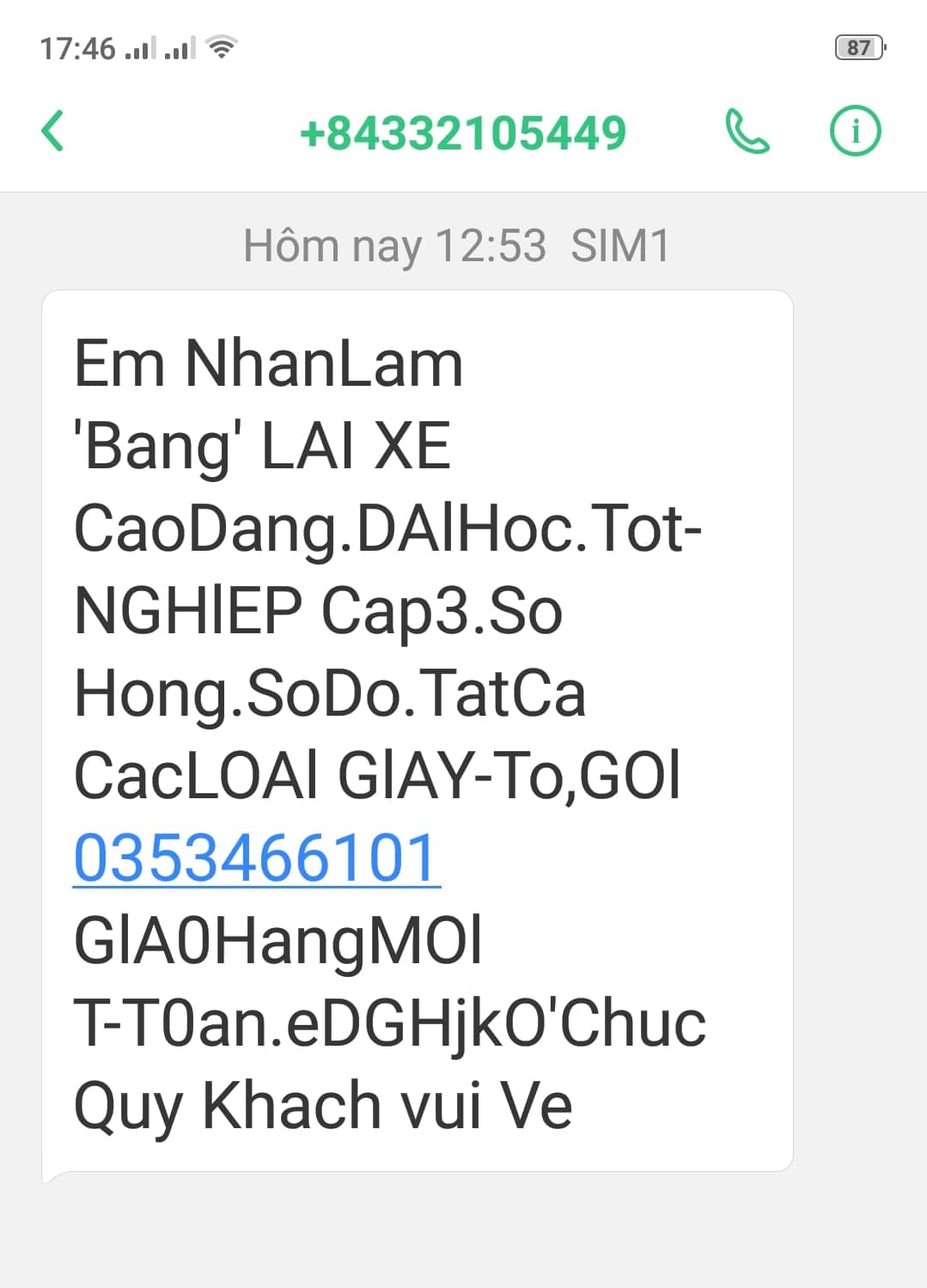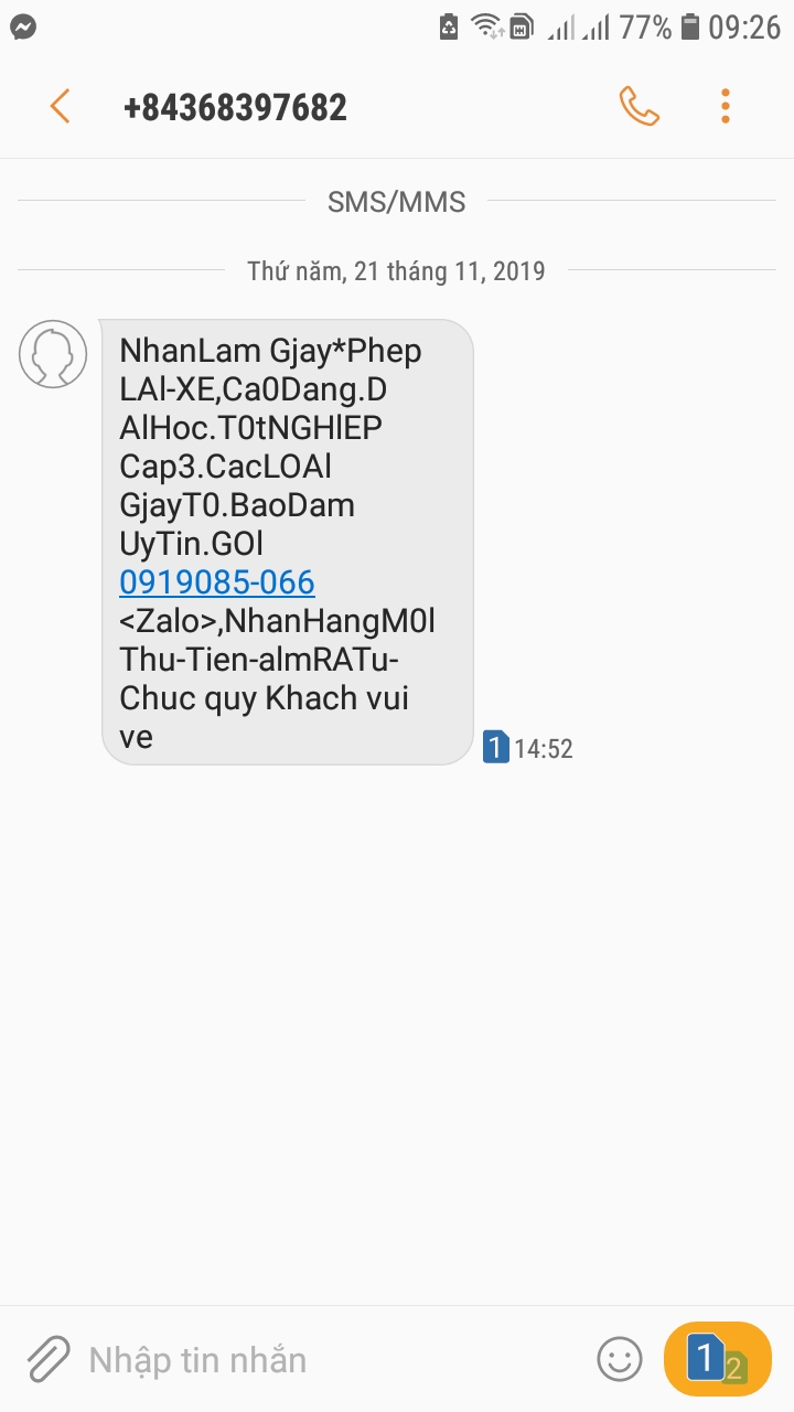 Số điện thoại trong hình đã chụp, thường nhắn tin rác mời tôi làm giấy tờ giả. Đề nghị cơ quan chức năng rà soát, có phương án xử lý với tình trạng này!