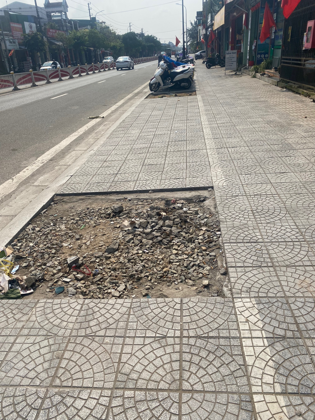 Vỉa hè đoạn Nguyễn Tất Thành, phường Phú Bài hoàn thành đã lâu nhưng những ô trồng cây xanh vẫn còn ngổn ngang đất đá, tài sản của người dân bị để dưới ánh nắng gắt dẫn đến nhanh chóng bị hư hại, phải tự che đậy rất lộn xộn mất mỹ quan đô thị. Thời tiết quá oi bức ban ngày người dân không thể sinh hoạt và buôn bán được. Kiến nghị nhà nước nhanh chóng hoàn thành trồng lại cây xanh để trả bóng mát cho người dân vì đã đến mùa hè.