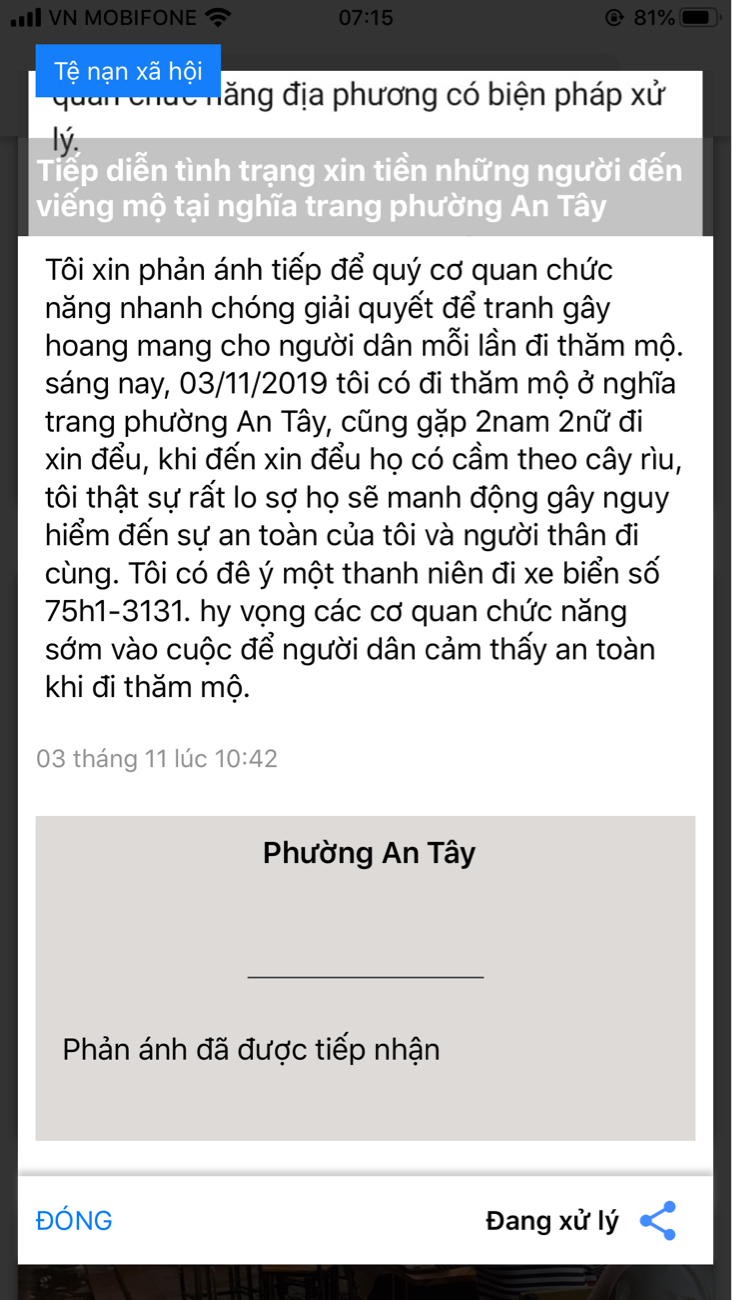 - Phản ánh thể hiện có một số thanh niên xăm trổ (2 nam, 2 nữ) có cầm dao rựa xin đểu tiền nhưng không phản ánh cụ thể đặc điểm nhận dạng đối tượng, không có hình ảnh để xác minh nên Công an phường không có cơ sở xác minh và xử lý. Tuy nhiên, Công an phường An Tây đã phối hợp Đội Điều tra tổng hợp và Đội Cảnh sát Điều tra tội phạm về trật tự xã hội công an thành phố Huế xác minh và làm việc với 04 đối tượng có hành vi xin tiền tại khu vực nghĩa trang nhân nhân thành phố Huế (trong đó: có 02 (hai) đối tượng thường trú tại phường An Tây, còn lại thường trú tại phường An Đông).