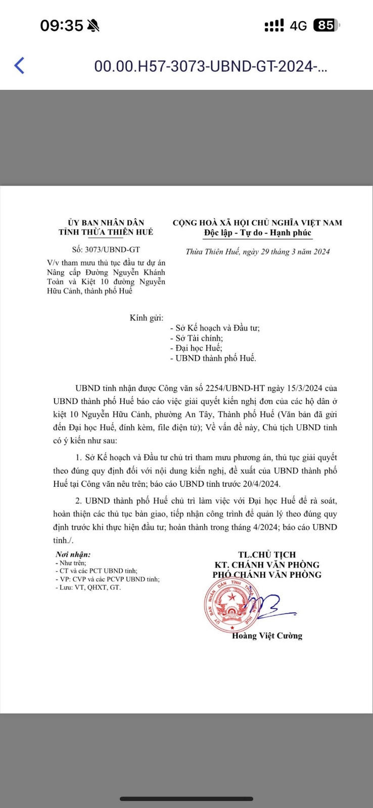 Kính gửi: Giám đốc Đại học Huế, vào tháng 10/2023 chúng tôi có phản ánh con đường đất Nguyễn Khánh Toàn không được đầu tư, Đại học Huế có trả lời hiện nay Đại học Huế không có kinh phí đầu tư. Vậy khi nào tỉnh cấp kinh phí đầu tư như công văn đính kèm thì Đại học có phối hợp triển khai không? Có vướng mắc gì không vì con đường đất này quy hoạch là đường dân sinh thuộc quỹ đất quy hoạch dân ở nên chúng tôi bắt buộc phải đi lại sinh hoạt trên con đường này. Xin đính chính tháng 10/2023 Đại học Huế có trả lời con đường tạm xây dựng năm 2004 là đường bao quanh chống lấn chiếm là sai thực tế.