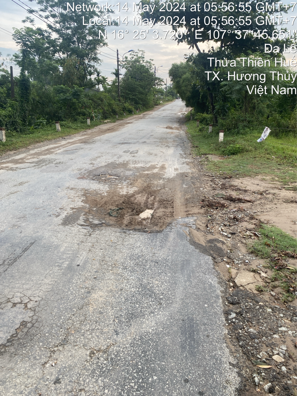 Phản ánh tuyến đường Dạ Lê ,Phường Thuỷ Phương ,Thị Xã Hương Thuỷ Tỉnh Thừa Thiên Huế, bị hư hỏng nhiều vị trí từ đoạn trường cấp 3 Hương Thủy đến nhà Máy Gạch Tuy Nen Số 3 nhưng chưa thấy cơ quan chức năng xử lý. Đã có nhiều vụ tự té ngã do đường xuống cấp. Kính đề nghị cơ quan chức năng xử lý sớm cho bà con dân nhân thuận tiện đi lại an toàn. Có hình ảnh chụp lúc 5h56 phút sáng này 14 tháng 5 năm 2024. Xin chân thành cám ơn !