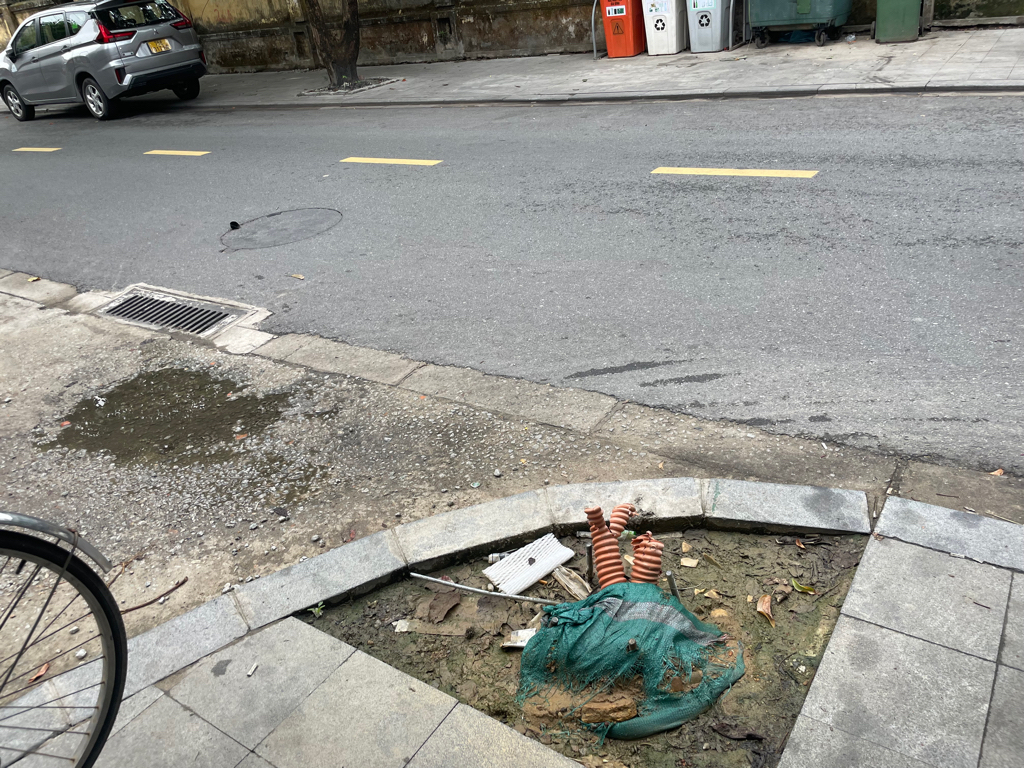 Ngay góc hẻm 111 Nhật Lệ phường Đông Ba, có móng chờ trụ điện rất nguy hiểm cho người đi đường.