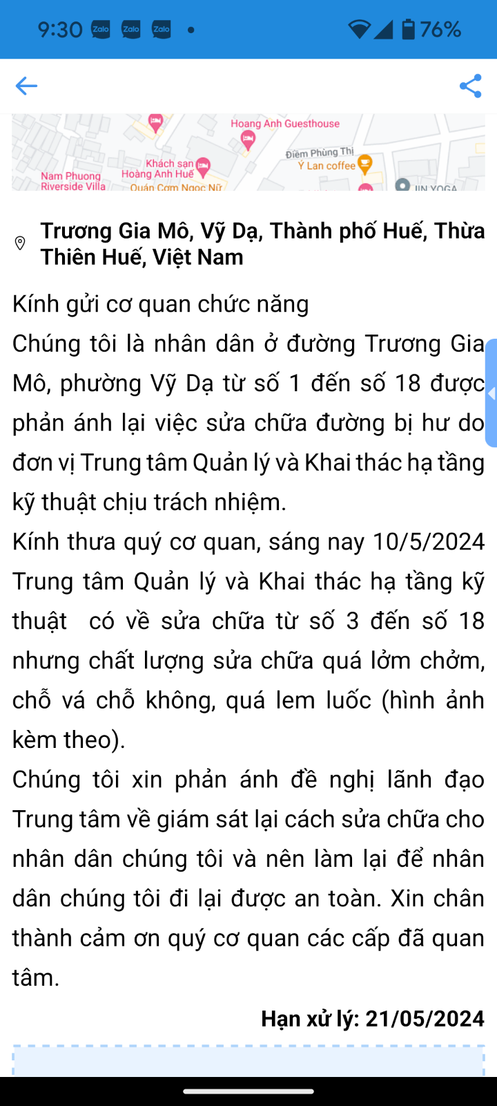 Như phản ánh lần 2 vào ngày 10-5-2024 về việc sửa chữa đường từ số 1 đến số 18 Trương Gia Mô, phường Vỹ Dạ (kèm theo phản ánh đã được duyệt và hẹn ngày xử lý là 21-5-2024) nhưng không thấy Trung tâm quản và khai thác hạ tầng kỹ thuật xem xét mà ngày 21-5 Trung tâm quản lý chỉ trả lời đã làm xong ngày 10-5-2024. Nhưng chúng tôi không thỏa mãn việc sửa chữa vì chỗ sửa chỗ không rất lem luốc, vẫn còn bị lỗm chỗm. Từ phản ánh này kính mong lãnh đạo Trung tâm về giám sát thực tế để tu bổ cho nhân dân chúng tôi đi lại an toàn hơn. Chân thành cảm ơn quý cơ quan.