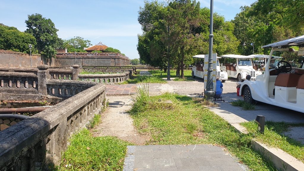 Về phần vỉa hè hai bên cửa Hiển Nhơn nằm trong dự án đã được Trung tâm Công viên Cây xanh Huế chỉnh trang lát đá đường dạo, phần còn lại chưa hoàn thiện thuộc Trung tâm Bảo tồn Di tích Cố đô Huế quản lý.