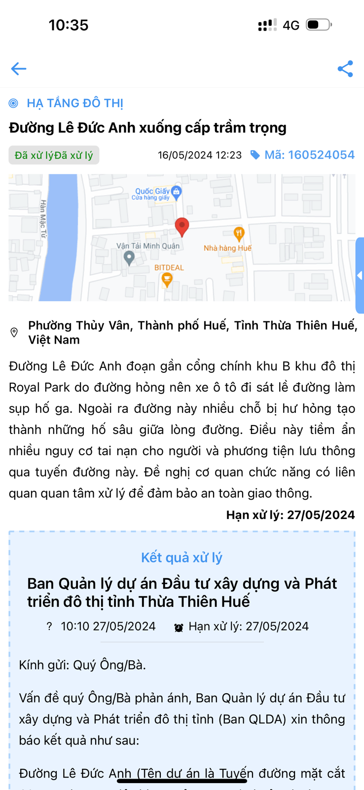 Vấn đề quý Ông/Bà phản ánh, Ban Quản lý dự án Đầu tư xây dựng và Phát triển đô thị tỉnh (Ban QLDA) xin thông báo kết quả như sau: