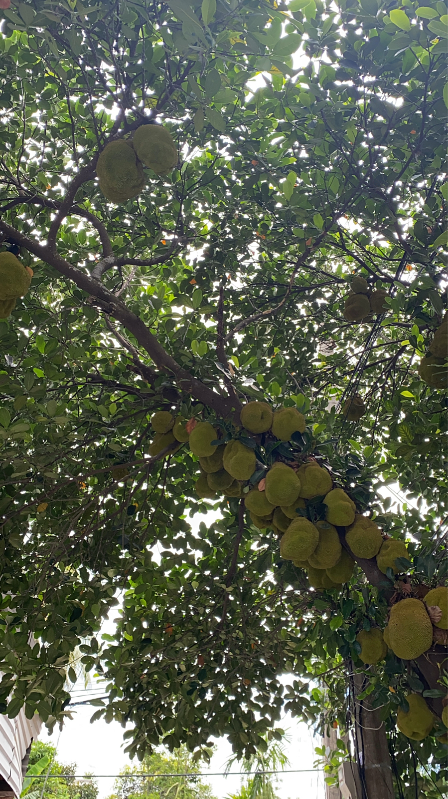 Hình ảnh được chụp vào lúc 14:15 ngày 12/06/2024. Cây mít trĩu trái đổ ra ngay giữa đường đi gây nguy hiểm cho người dân lưu thông qua lại ngay tại đầu hẻm 36 Nguyễn Hoàng phường Kim Long.