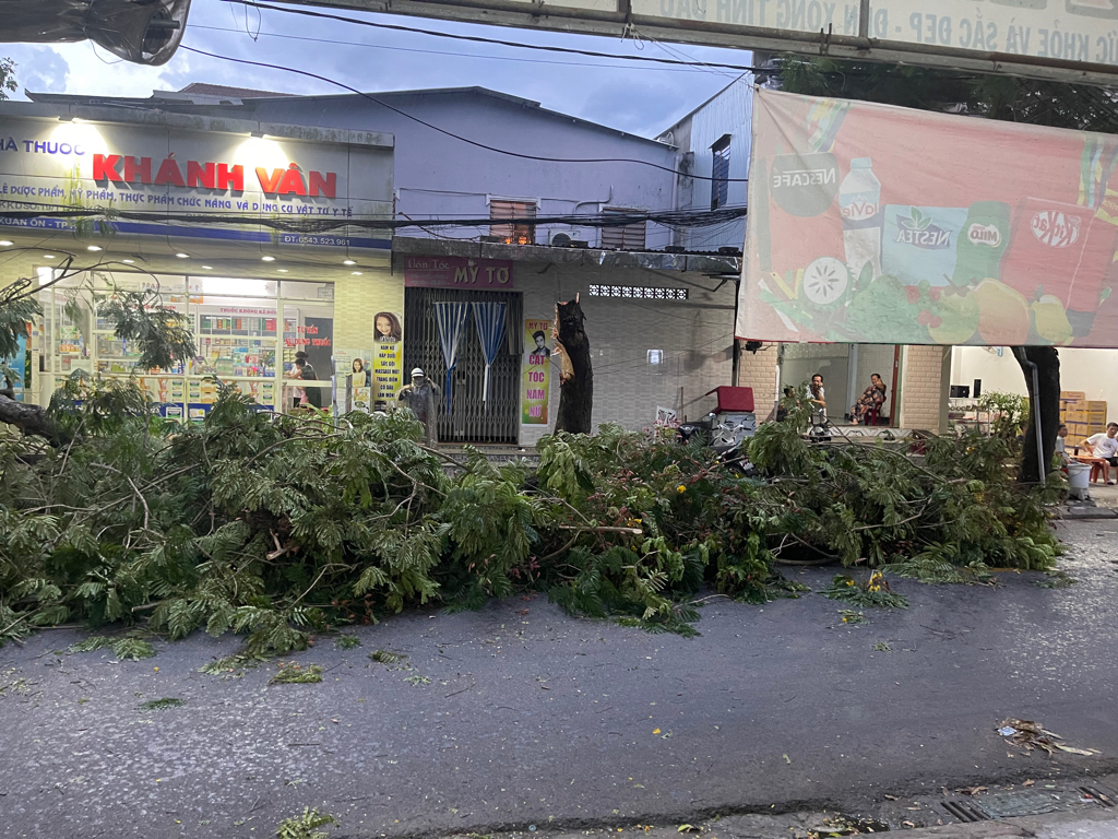 Cây đổ chắn ngang đường gây nguy hiểm ở ngã tư đường Thái Phiên và Nguyễn Xuân Ôn, phường Thuận Lộc. Hình ảnh ghi lại lúc 18h15 ngày 16/06/2024.