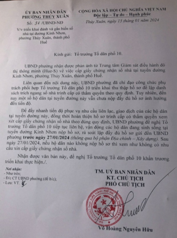 Xin phép được hỏi là đến lúc nào thì đường Kinh Nhơn, phường Thủy Xuân mới được cấp số nhà? Cảm ơn.