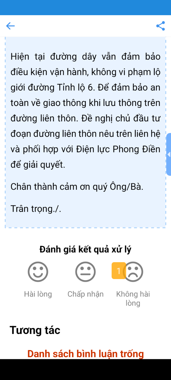 Đề nghị Chính quyền địa phương làm việc, can thiệp các công ty liên quan để di dời các trụ điện, trụ viễn thông sang vị trí khác, chứ ở vị trí hiện tại tuy không vi phạm lộ giới đường TL6 nhưng lại nằm gần giữa tim đường liên thôn do Nhà nước mới đầu tư xây dựng (khoảng 1 năm), rất nguy hiểm nhất là vào ban đêm. Tôi là người dân trong xóm Phú An, thôn Đức Phú này nên rất mong muốn được lắng nghe, tiếp thu và thực hiện trong thời gian sớm nhất.