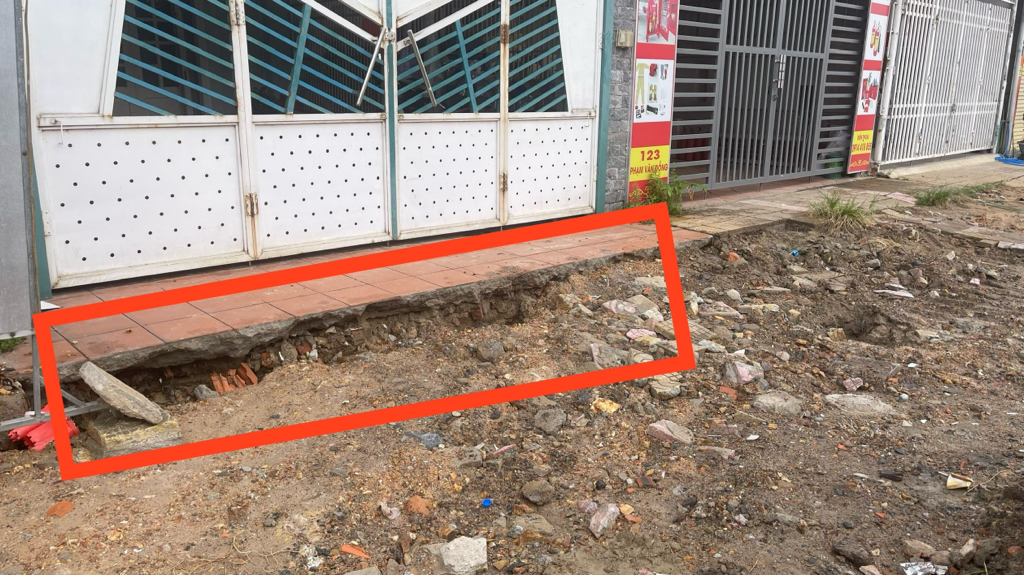 1. Nền đất sụt lún tạo thành nhiều hố sâu, không biết có thông với lòng đất luôn không, đã có người đang đi bỗng dưng ngã xuống hố, may chỉ bị xây xát nhẹ. Khu vực này nhiều trẻ con và đông người qua lại sẽ là mối nguy hiểm tiềm tàng, ảnh hưởng tới tính mạng.
