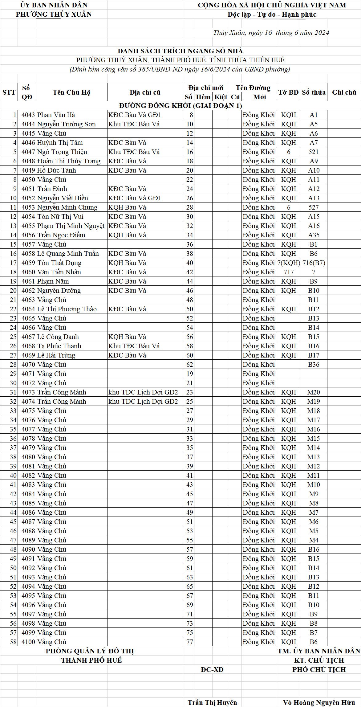 Hiện nay UBND phường đã triển khai thu thập thông tin tuyến đường Đồng Khởi và đã trình phòng Quản lý đô thị thành phố thẩm định cấp số nhà có các hộ mặt tiền tuyến đường chính.