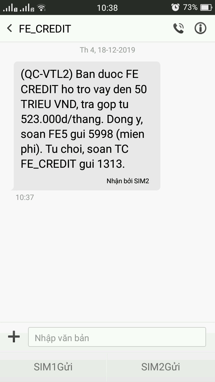 Như vậy, tin nhắn mà quý Ông/Bà nhận được là Quảng cáo đúng quy định theo Nghị định 90/2008/NĐ-CP. Nếu Ông/Bà không quan tâm với nội dung tin nhắn trên thì Ông/Bà có thể nhắn theo cú pháp của nhà cung cấp dịch vụ để từ chối nhận tin nhắn những lần tiếp theo.