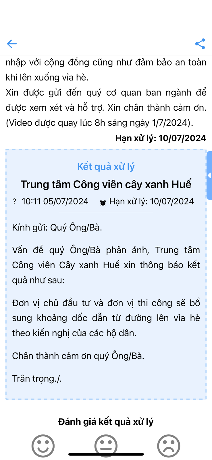 Như đã có phản ánh vào ngày 5/7/2024 về việc kiến nghị bổ sung khoảng dốc từ đường lên vỉa hè cho kiệt 111 An Dương Vương. Tôi đã nhận được phản hồi về việc sẽ bổ sung như quý cơ quan đã trả lời như ảnh đính kèm.