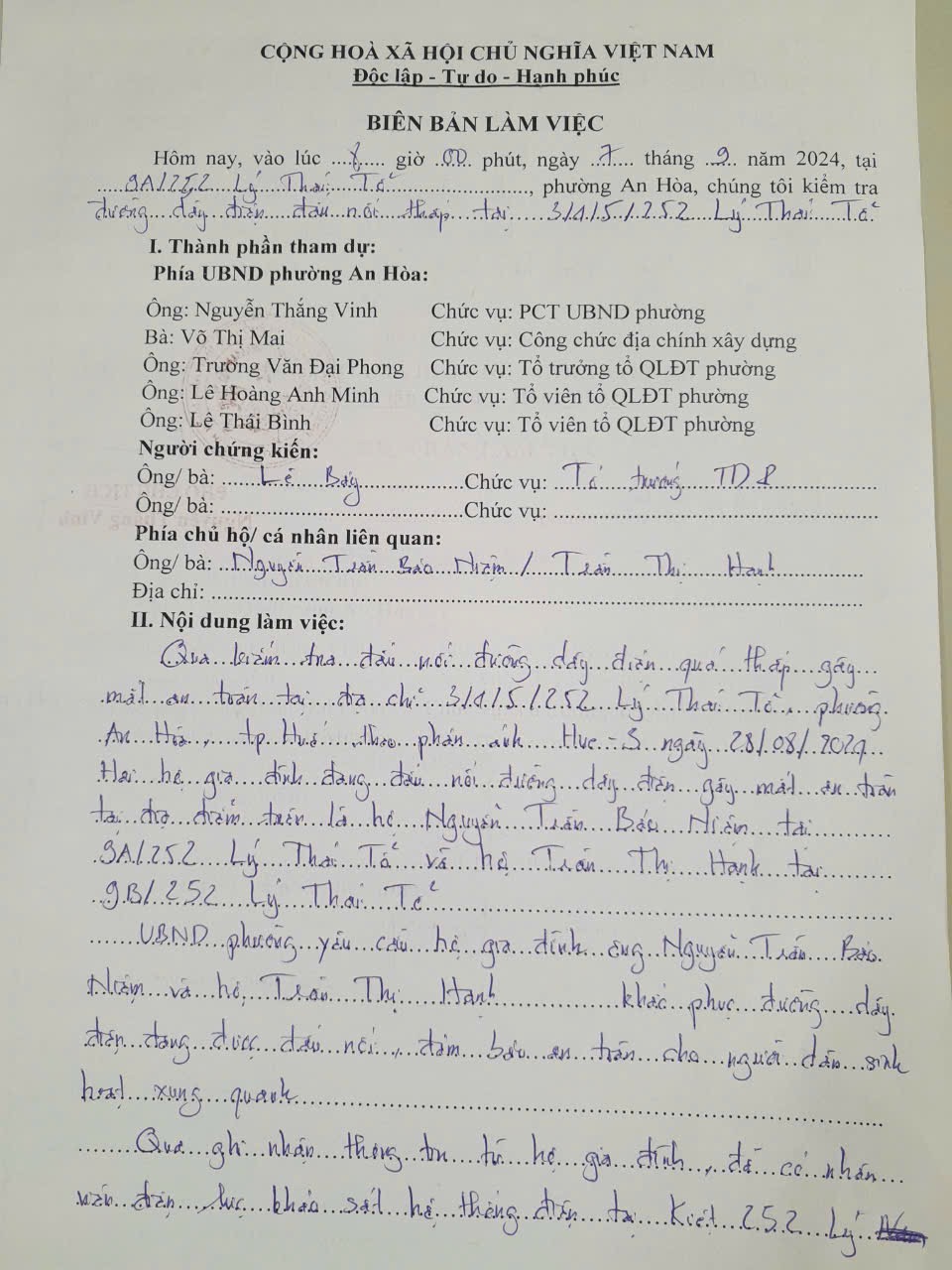 UBND phường đã chỉ đạo Tổ quản lý đô thị kiểm tra xác minh tại vị trí phản ánh. Đề nghị hộ gia đình khắc phục đường dây điện đang được dấu nối đảm bảo an toàn cho các hộ xung quanh, hộ gia đình cam kết sẽ đấu nối cột mới ngay sau khi hệ thống đường dây được đầu tư( đính kèm biên bản làm việc)