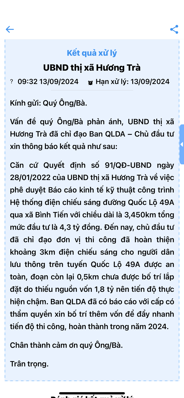 Theo kết quả xử lý của Hues và trả lời của UBND thị xã Hương Trà: hoàn thành trong năm 2024. Nhưng đến nay chuẩn bị hết tháng 2/2025 rồi mà điện trên tuyến đường Quốc lộ 49A đoạn qua xã Bình Thành vẫn chưa sáng.