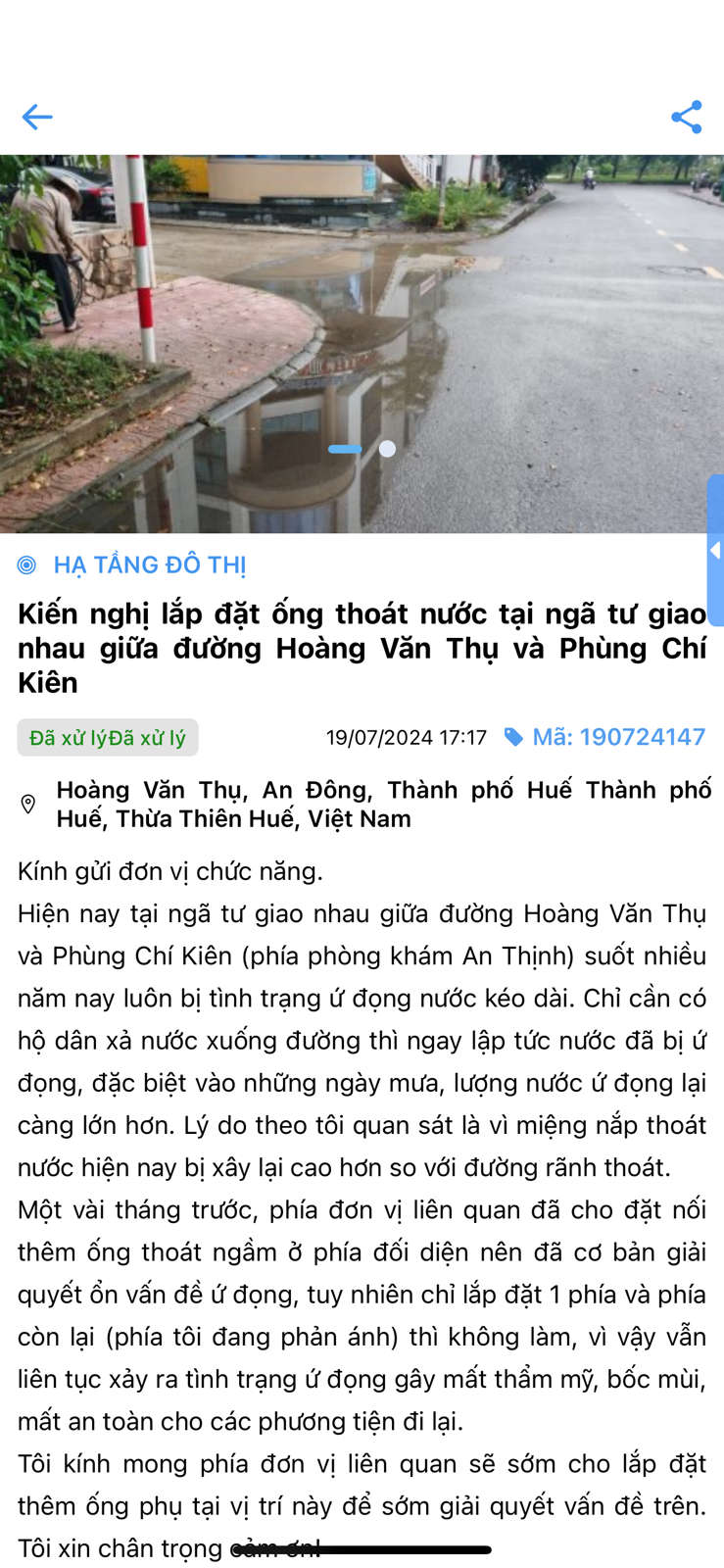 Trong kiến nghị phản ánh về lắp đặt thêm họng thu để xử lý vấn đề ứ đọng nước tại vị trí ngã tư giao nhau giữa đường Hoàng Văn Thụ và Phùng Chí Kiên (phía phòng khám An Thịnh) vào ngày 19/07/2024, và đã nhận được kết quả phản hồi từ phía cơ quan chức năng thông báo (ngày 30/07/2024) sẽ tiến hành xử lý, bổ sung tại đây trong tháng 8/2024 (có ảnh kèm theo). Tuy nhiên cho đến thời điểm hiện tại, tại vị trí này vẫn chưa được xem xét xử lý theo đúng như nội dung đã được trả lời với người dân, tình trạng nước ứ đọng nhất là vào cao điểm mùa mưa như hiện nay vẫn diễn ra liên tục làm ảnh hưởng đến cuộc sống của người dân.