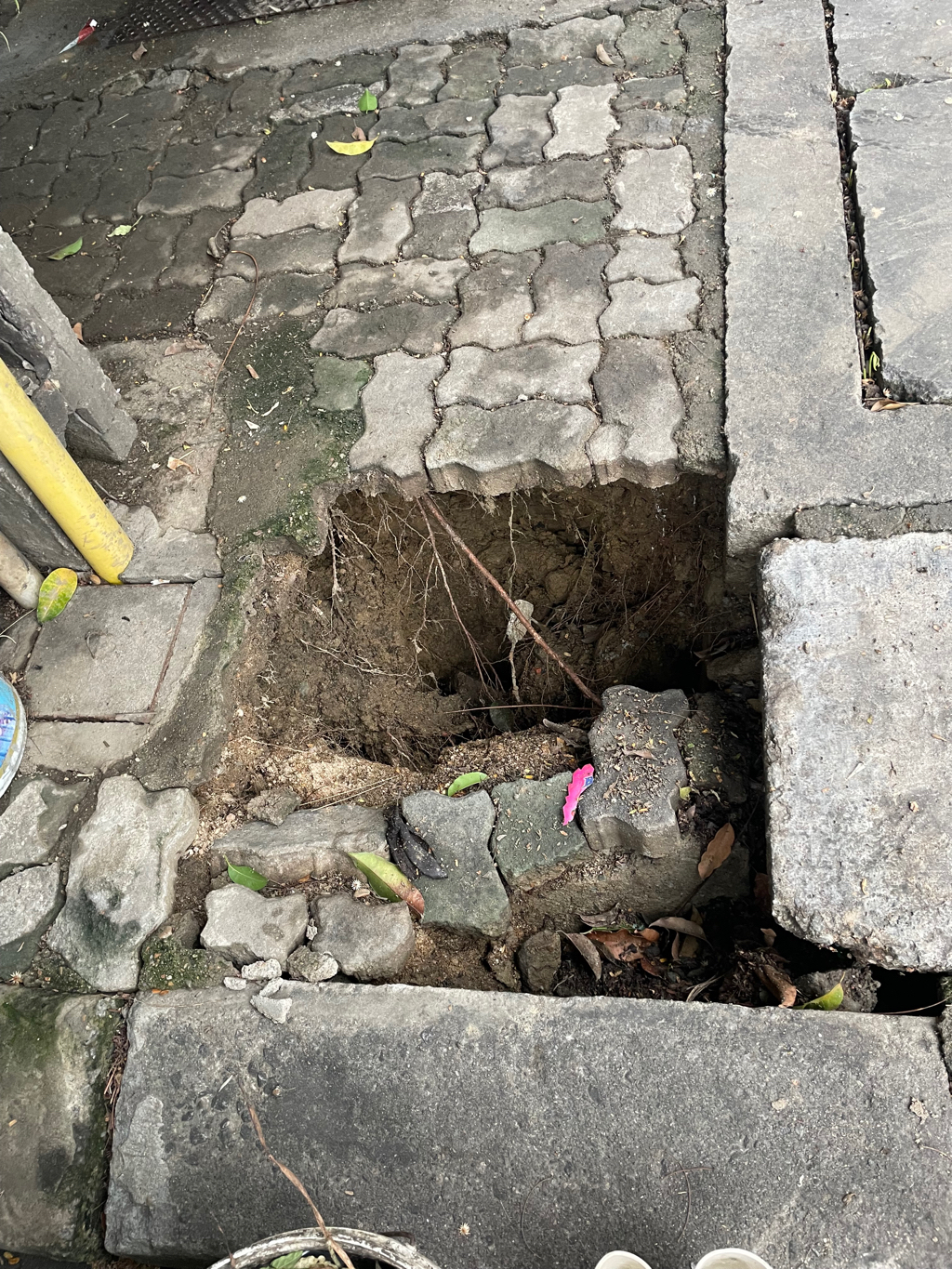 Hố sụt lún khoảng 1m sâu 1,5 mét kế bên trụ điện nhà 580 Lê Duẩn. Đề nghị khắc phục. Ảnh chụp lúc 18h30 ngày 23 tháng 9 năm 2024.