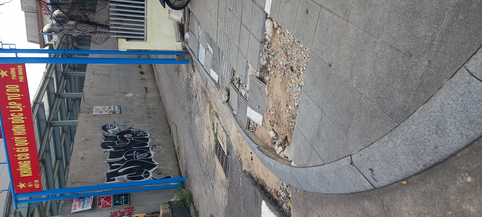 Vỉa hè bị hư hỏng ở đầu kiệt 26 Hà Nội, phường Phú Nhuận gây nguy hiểm cho người đi bộ. Ảnh chụp lúc 15h30 ngày 25-9-2024.