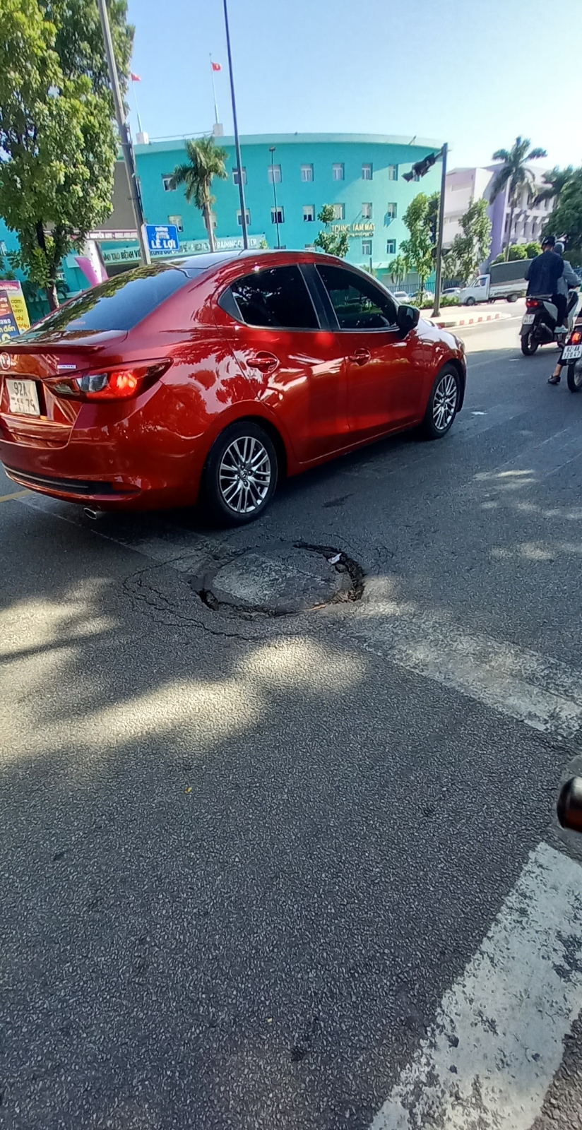 Đường Lê Lợi có một chỗ bị hư hỏng, điều này gây mất an toàn giao thông, mất mỹ quan tuyến đường. Vì vậy, tôi xin kiến nghị cơ quan chức năng có phương án sửa chữa. Hình ảnh được tôi chụp lại lúc 10h15 phút giờ ngày 27/9/2024. Vị trí: Trước số 18 Lê Lợi.
