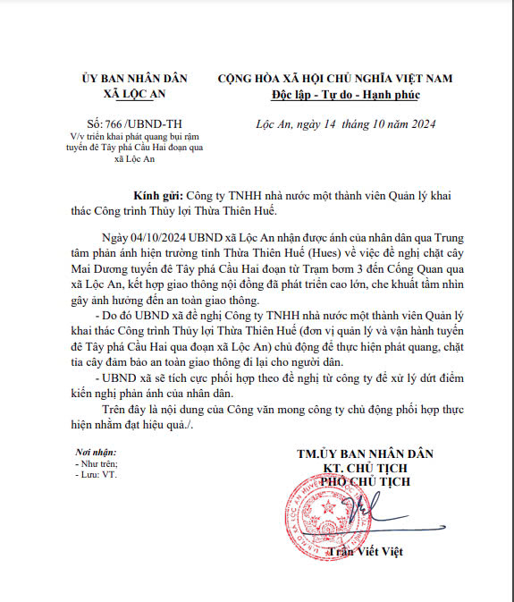 Tuyến đê Tây phá Cầu Hai đoạn qua xã Lộc An có chiều dài 1.232,6m trong đó đoạn Trạm Bơm 3 xã Lộc An đến Cống Quan xã thôn Châu Thành xã Lộc An chiều dài 820m; đảm bảo chống lũ tiểu mãn, lũ sớm, ngăn mặn xâm nhập, bảo vệ trực tiếp cho 800ha đất nông nghiệp thuộc xã Lộc An do Công ty TNHH nhà nước một thành viên Quản lý khai thác Công trình Thủy lợi Thừa Thiên Huế trực tiếp khai thác, vận hành và bảo dưỡng. UBND xã ban hành Công văn số 766/UBND-TH, ngày 14/10/2024 gửi Công ty khai thác Công trình Thủy lợi Thừa Thiên Huế đề nghị sớm tổ chức việc triển khai phát quang bụi rậm truyến đê Tây phá Cầu Hai qua địa phận xã Lộc An, đảm bảo an toàn trong quản lý, vận hành và thuận tiện trong việc lưu thông của bà con nhân dân.(đính kèm công văn)