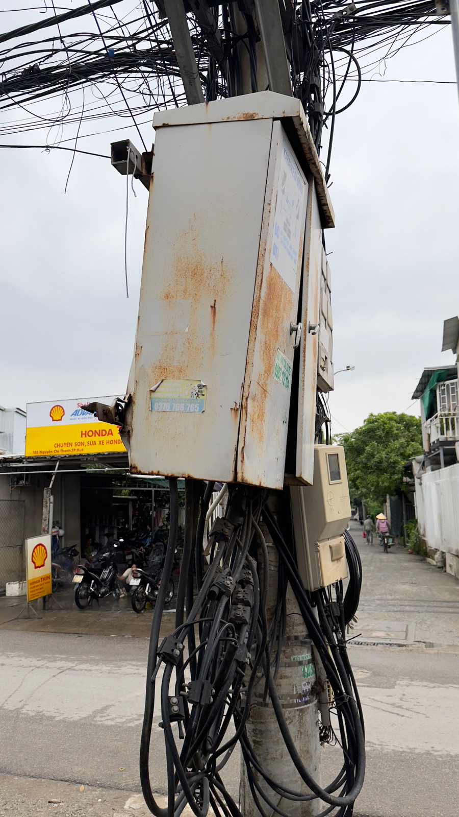 Tủ điện đổ ra đường kiệt 159 Nguyễn Chí Thanh rất nguy hiểm cho người và phương tiện ra vào.