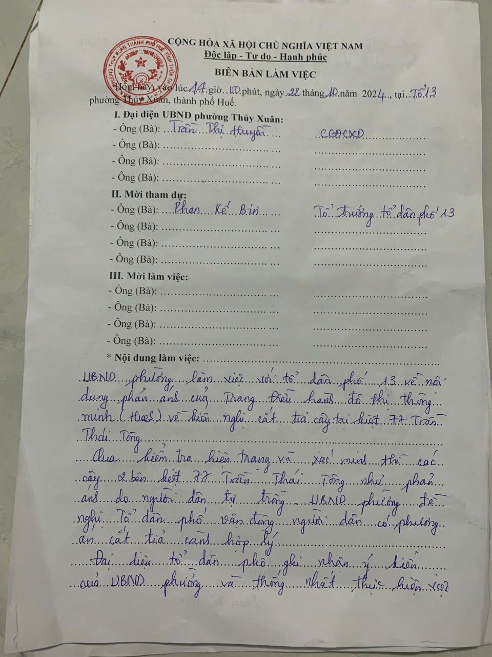 Vấn đề quý Ông/Bà phản ánh, UBND phường Thủy Xuân xin thông báo kết quả như sau: