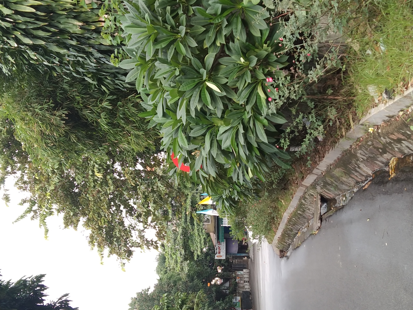 Dãy cây hoa sứ che khuất biển báo tại đường Đoàn Hữu Trưng, phường Phước Vĩnh, thành phố Huế. Biển báo và cây hoa nằm ngoài hàng rào của Nhà thờ Phủ Cam. Ảnh chụp vào khoảng 15h39 phút ngày 21/10/2024.