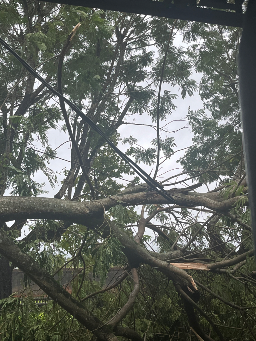 Cây phượng gãy đè lên dây điện, rất nguy hiểm tại trước cổng nhà 109 Lê Huân, Huế. Kính mong cây xanh xử lý.