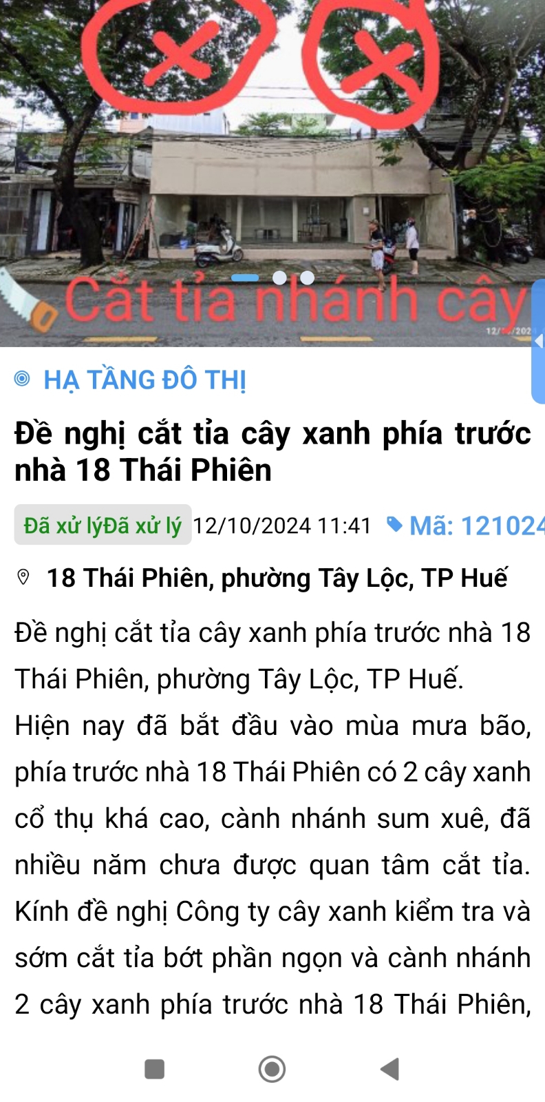 Cây gãy đổ ngã đè lên mái nhà 18 Thái Phiên, phường Tây Lộc, thành phố Huế. Mặc dù đã phản ánh và đề nghị Trung tâm cây xanh Huế cắt tỉa 2 cây xanh trước nhà 18 Thái Phiên, nhưng chỉ cắt tỉa mé cành nhánh nhỏ. Hôm qua 27/10 bị bão số 6 gây đổ ngã nhánh cây lớn ĐK 25cm đè lên mái nhà và bít lối đi. Kính đề nghị Trung tâm cây xanh Huế sớm xử lý cắt ngọn và nhánh cây lớn ĐK 30cm phiá trước nhà 16 và 18 Thái Phiên, có nguy cơ tiếp tục đỗ ngã lên mái nhà, gây thiệt hại tài sản và tính mạng của người dân. Chân thành cảm ơn.