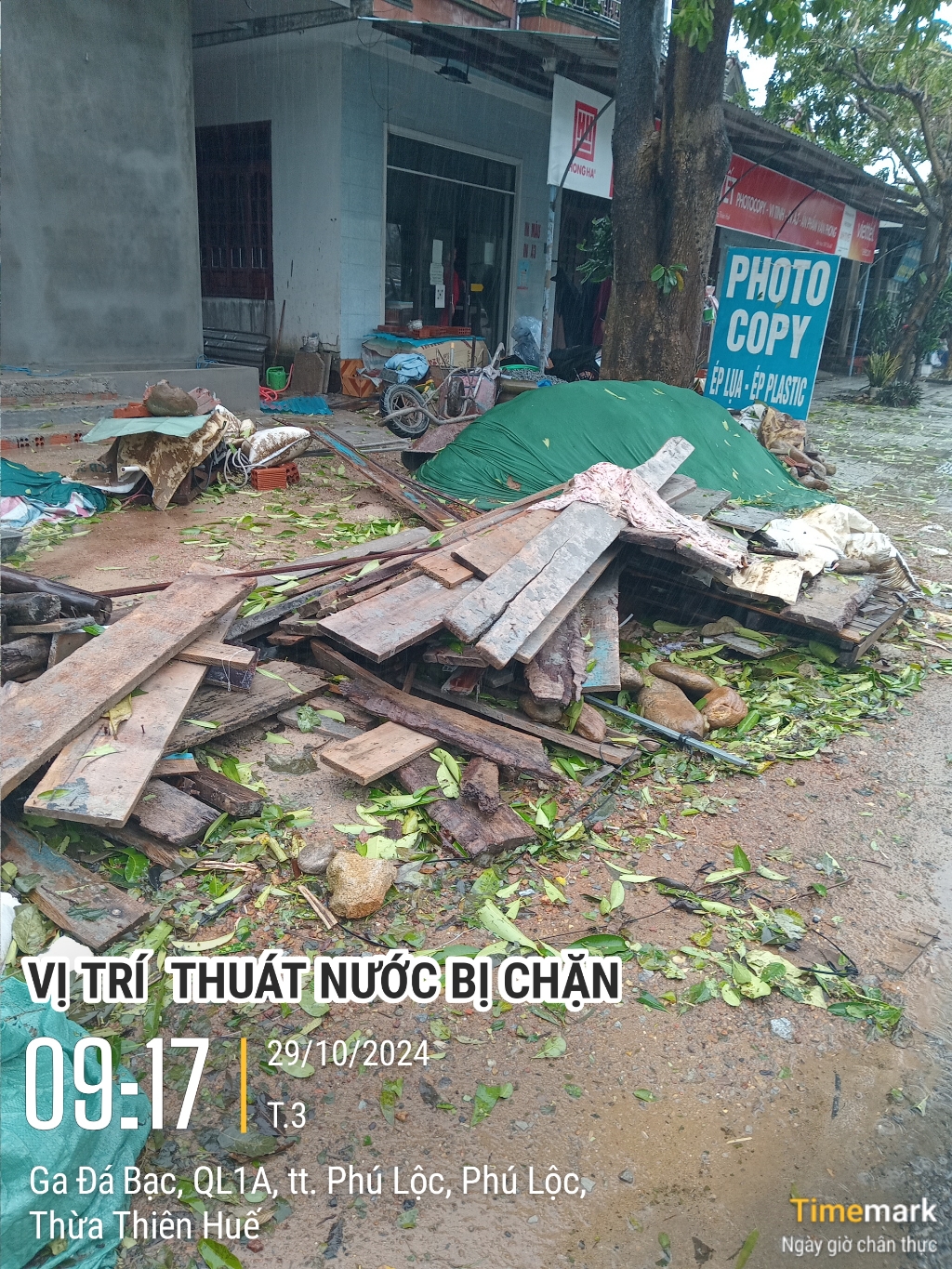 Do ảnh hưởng của cơn bão số 6 và hoàn lưu sau bão gây mưa lớn từ ngày 26/10/2024 đến 01/11/2024 nên đoạn đường trước buu điện huyện Phú Lộc thoát nước không kịp gây nước tràn mặt đường một số vị trí, Văn phòng Quản lý đường bộ II.5 chỉ đạo đơn vị bảo dưỡng thường xuyên tuyến vệ sinh các của thu nước trên tuyến đường thị trấn phú lộc đảm bảo thoát nước kịp thời.