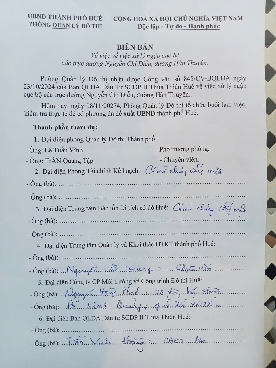 Ngày 08/11/2024, Ban QLDA đã phối hợp phòng Quản lý đô thị, Công ty CP môi trường và công trình đô thị Huế kiểm tra, đánh giá và đưa ra biện pháp khắc phục (đính kèm biên bản và hình ảnh).